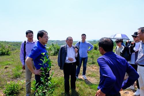 在油茶种植基地,江正君、刘桂华教授带领大家进行了实地考察。刘教授了解了当地油茶产业栽植现状和发展概况,结合立地条件,给油茶企业提供了一系列切实有效地提高油茶产量的建议,并针对油茶树种的栽培、套种技术、水肥管理和林下经济种植等问题进行了指导,以期获得更好的油茶收成,实现科技强农,切实助力乡村振兴。