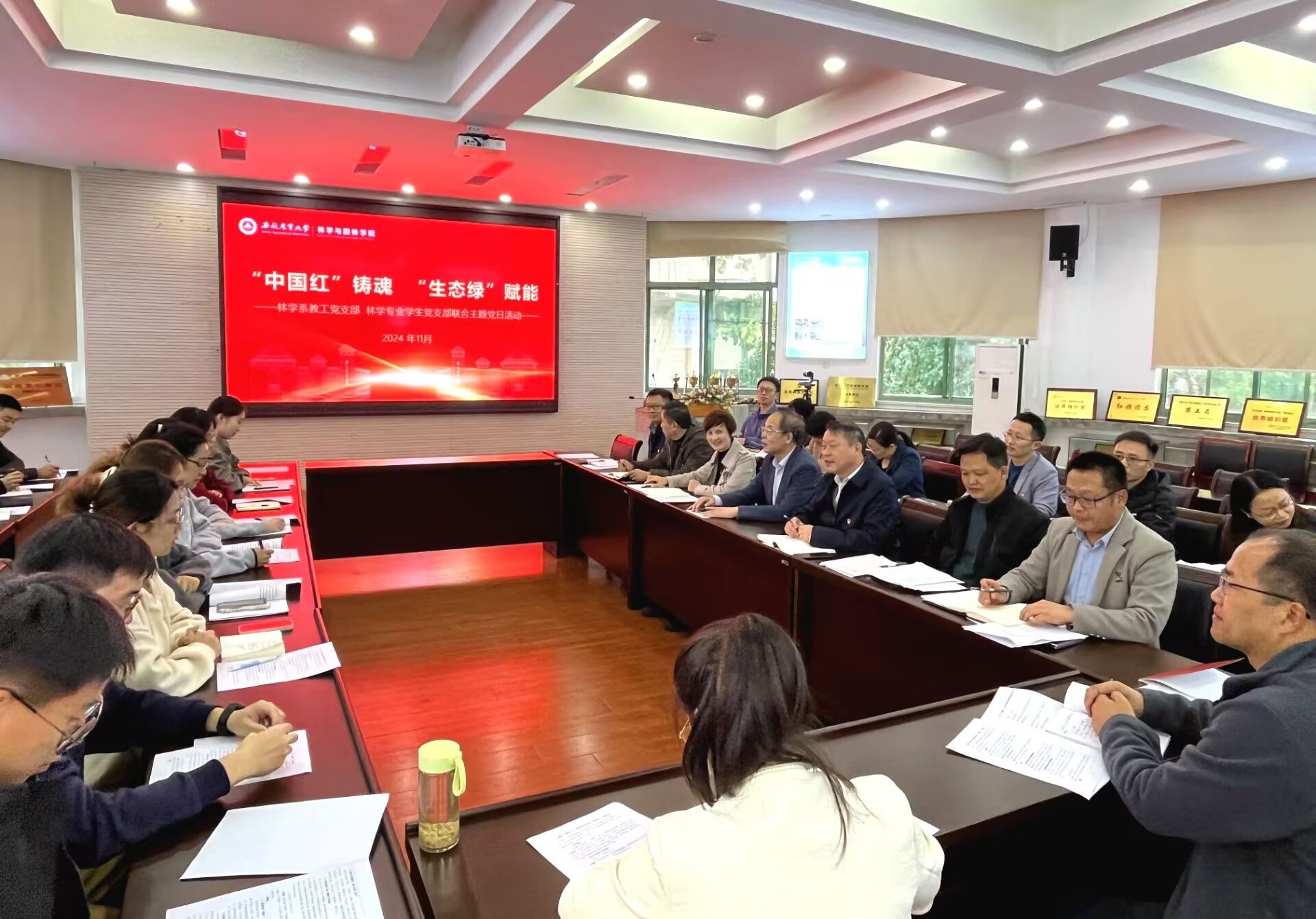 11月6日下午,林学与园林学院林学系教工党支部与林学专业学生支部在林学楼二楼报告厅联合开展“‘中国红’铸魂 ‘生态绿’赋能”主题党日活动。学院班子全体成员、林学系师生党支部全体党员参会。会议由林学系教工党支部书记唐雪海主持。