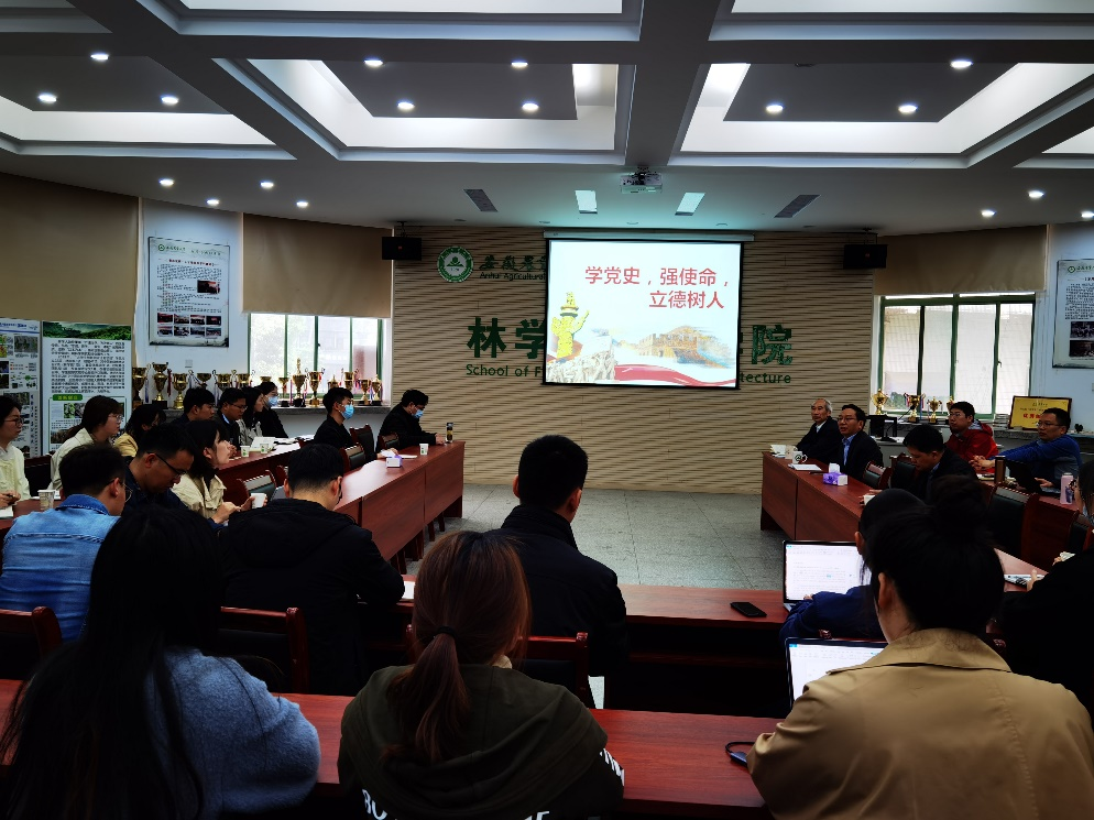 本网讯 4月7日上午,林学与园林学院举办第二届青年教师学术沙龙暨“学党史,强使命,立德树人”主题活动。学院院长刘盛全,副院长张龙娃、汪钟凯,林学与园林学院青年教师、研究生同学等40余人参加活动,活动由徐小牛教授主持。