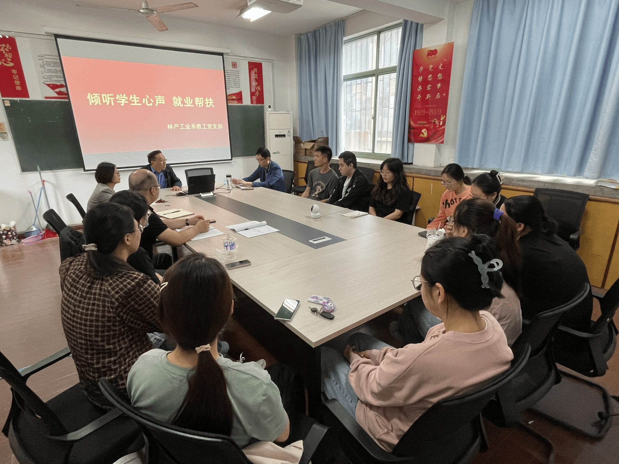 为深入学习贯彻党的二十大精神,推动学习贯彻习近平新时代中国特色社会主义思想主题教育走深走实,深入推进“我为师生办实事”实践活动,切实帮助就业困难学生尽早尽快就业,5月5日上午,林产工业系教工党支部针对19级木材科学与工程专业尚未就业的毕业生开展“倾听心声,就业帮扶”活动。学院院长刘盛全、林产工业系教工党支部全体支委、19级木材科学与工程专业班主任余敏和尚未就业的全体毕业生参加了此次活动,活动由林产工业系教工党支部书记郭勇主持。