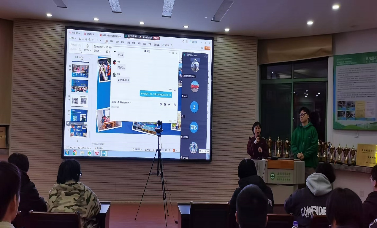12月10日,加拿大湖首大学中国办公室主任李思莹来到林学与园林学院,与林学(中外合作)专业师生座谈交流。学院副院长陆小彪、林学(中外合作)专业负责人刘华、林学(中外合作)专业毕业生丁宜及80余名学生参会,部分学生家长线上参会交流。