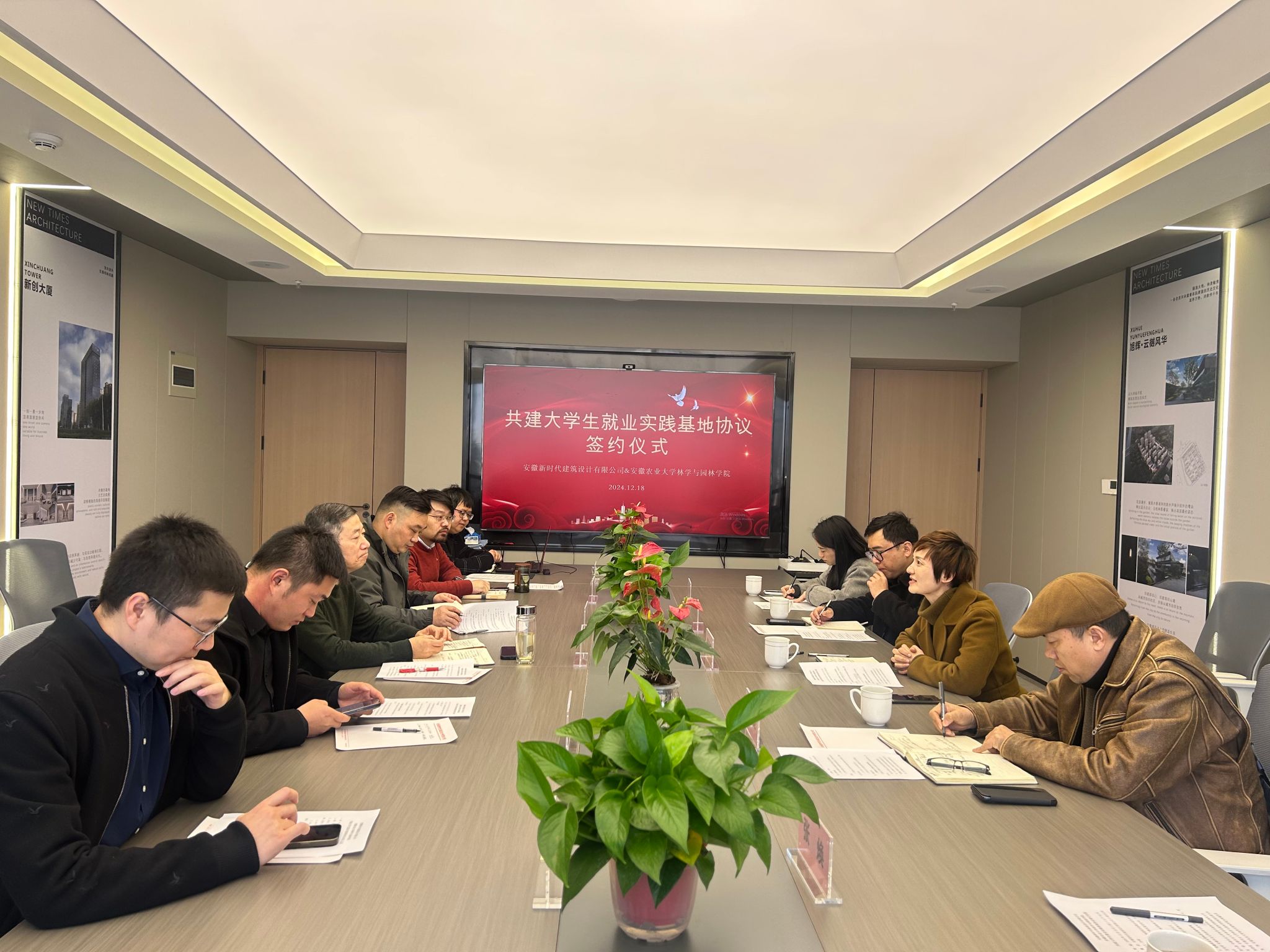 12月18日,安徽农业大学学生就业实习实践基地授牌仪式在安徽新时代建筑设计有限公司举行。林学与园林学院党委副书记夏利明,副院长陆小彪,城规系主任朱萌及相关教师,安徽新时代建筑设计有限公司董事长方传斌,学院2011届城规专业校友、安徽新时代建筑设计有限公司副总经理齐辉、安徽新时代建筑设计有限公司方案创作中心设计总监许明、安徽新时代建筑设计有限公司城市更新院副院长朱毅等出席授牌仪式。