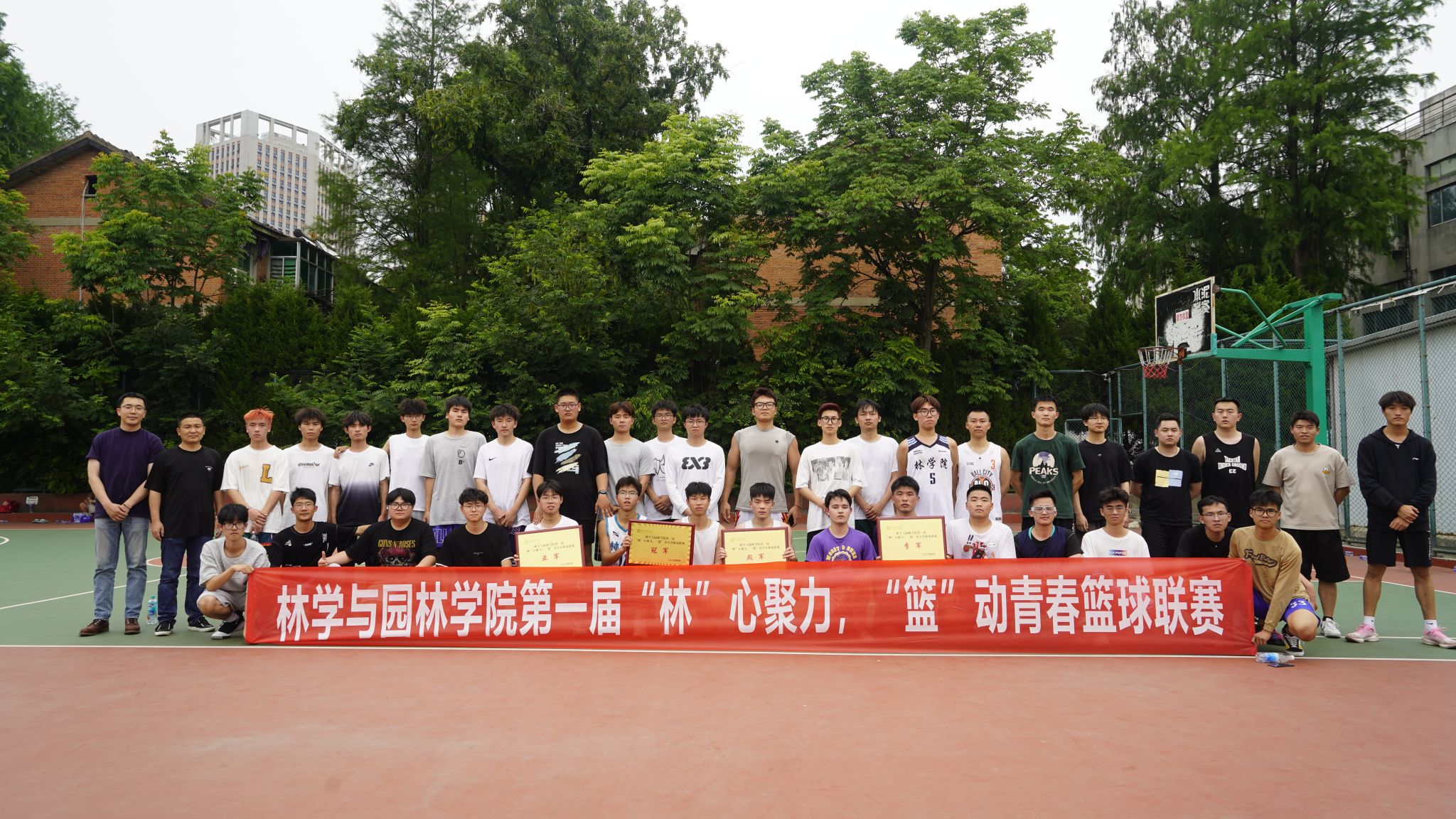 本网讯 5月16日中午,林学与园林学院“‘林’心聚力 ‘篮’动青春”篮球联赛在第二运动场落下帷幕。经过激烈比拼,20材料专业勇夺联赛桂冠,22木材专业、21城规专业、19木材专业分获亚军、季军和殿军。
