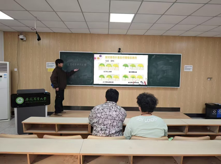 志愿服务中心负责人以及部门工作人员齐聚现场观看审核,并为活动提供了一些建议。此次试讲主题聚焦银杏叶变黄的奥秘。活动现场,林学专业志愿者化身科普小讲师,通过精心准备的PPT、生动形象的图片以及通俗易懂的语言,深入浅出地讲解银杏叶变黄背后的科学原理。从植物生理学角度剖析叶绿素分解、类胡萝卜素显现等过程,同时结合季节变化、环境因素等多方面知识进行阐述,让复杂的自然现象变得简单明了。
