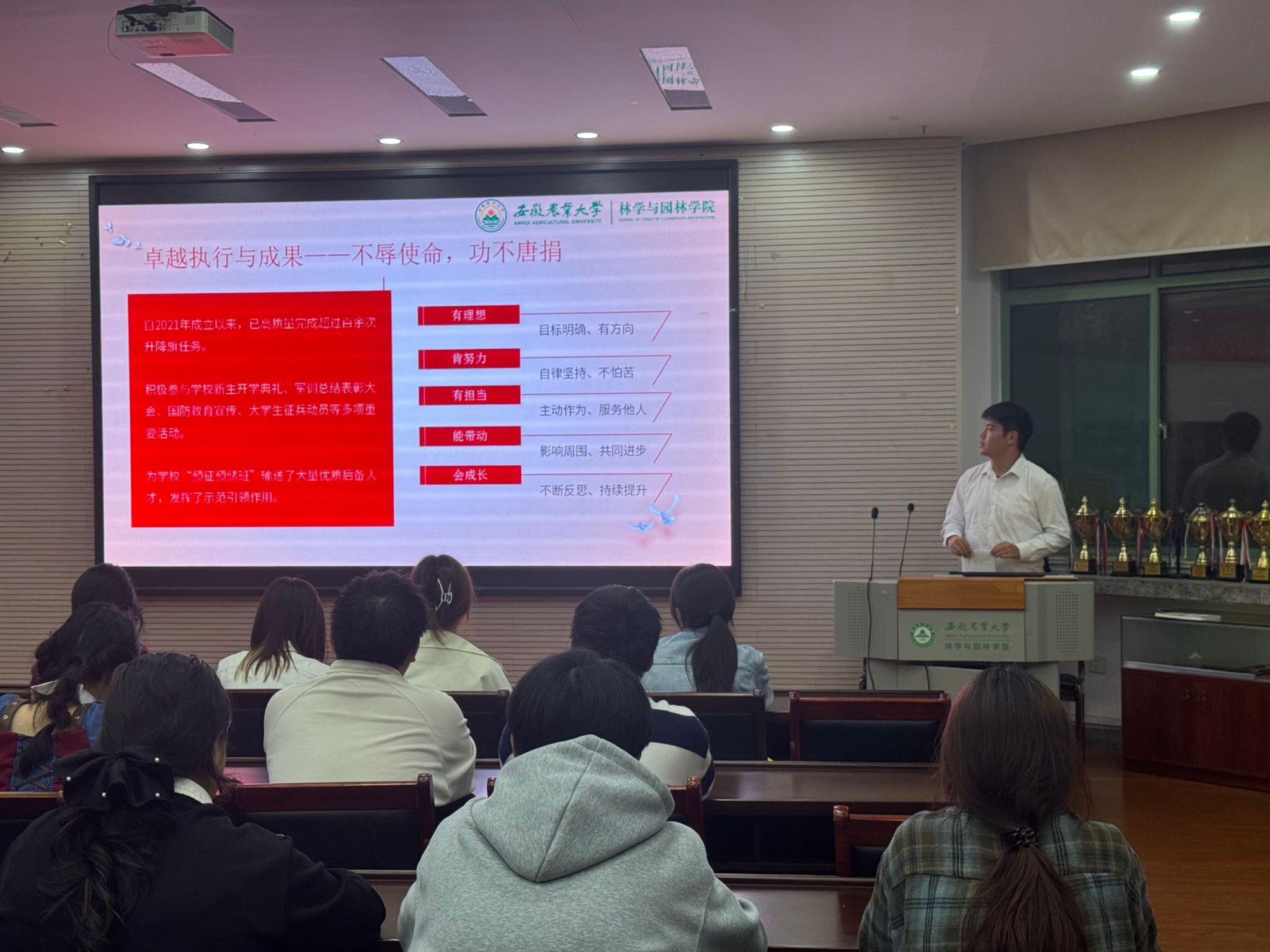 本网讯 为充分发挥优秀学子的示范引领作用,10月27日晚,林学与园林学院林学楼二楼报告厅举办“凝聚榜样力量,引领青春风尚”青春思享会。学院2025级全体学生骨干、团干参加活动,活动由学院团委老师主持。