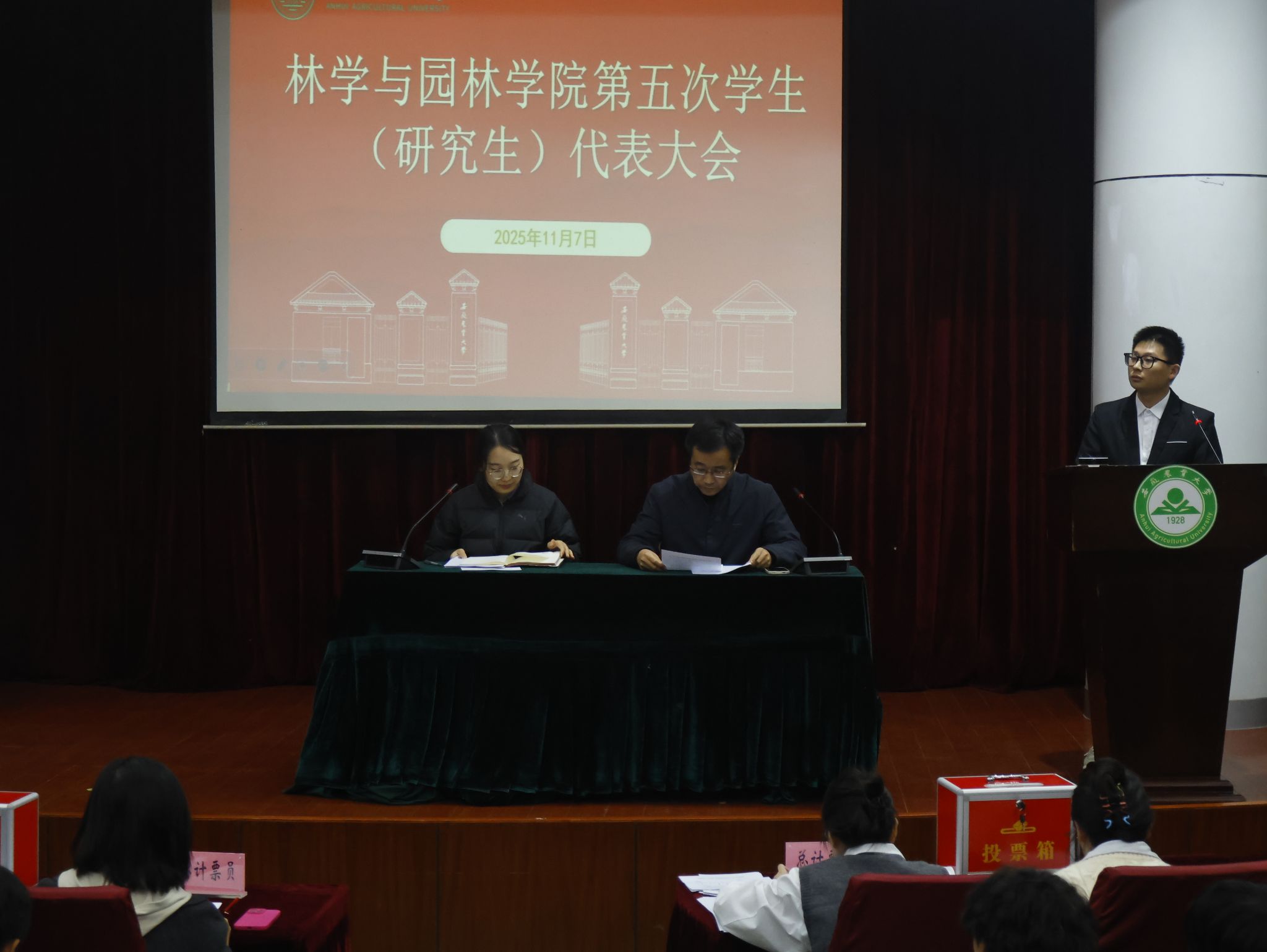 本网讯 11月7日晚,林学与园林学院第五次学生(研究生)代表大会在林学楼一楼报告厅顺利召开。学院党委副书记陈枫、院团委负责老师及全体学生(研究生)代表出席大会。
