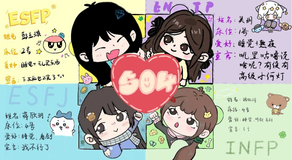 活动中,各寝室充分发挥想象力与动手能力X10#304寝室的悬挂式翻转装饰板,集手绘卡通、干花、日常标签与加油打气字样于一体,细节满满,充满治愈感G10#504寝室以MBTI人格测试为主题,手绘海报搭配个性宣言,生动展现寝室成员的多样性格与融洽氛围。