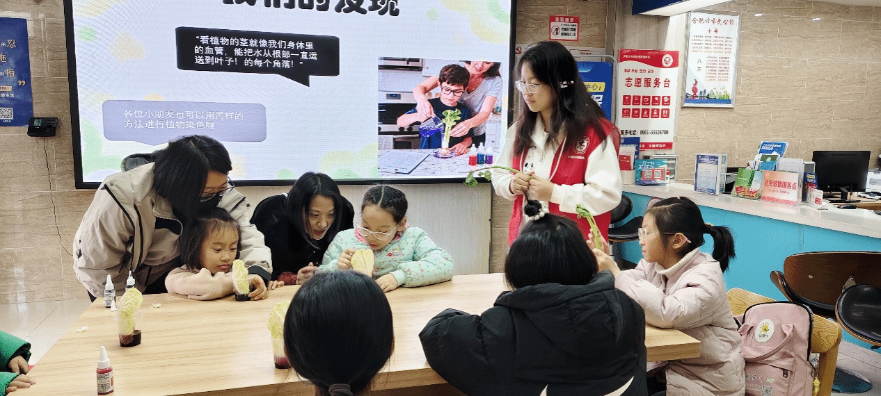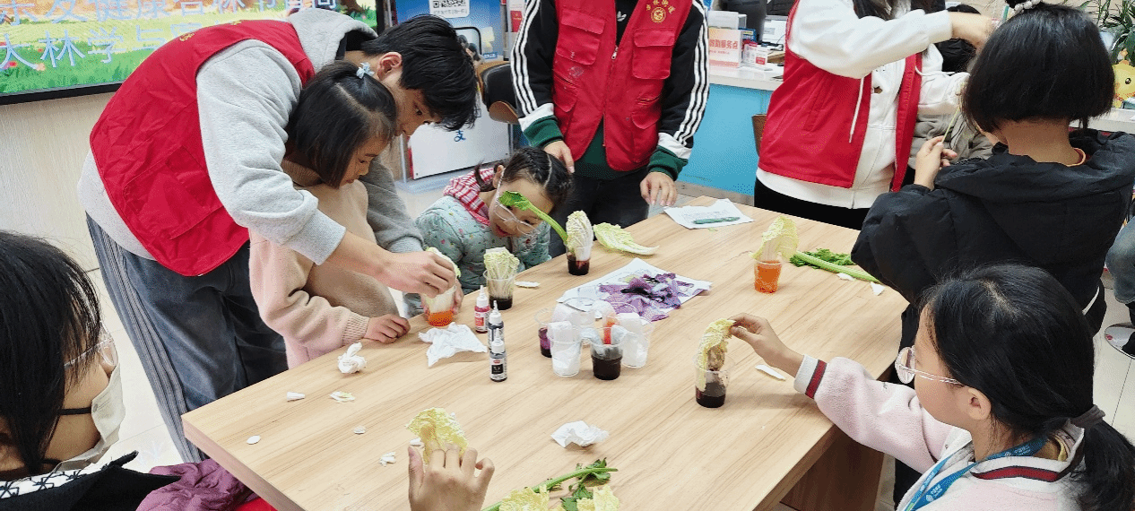 为增强参与感,活动特别设置了动手制作环节。孩子们在志愿者的耐心指导下,积极动手、主动尝试,利用芹菜、娃娃菜等材料制作了多彩的“染色蔬菜”作品。随后的“树叶为什么会变黄”科普讲解,进一步延伸了植物生命周期知识,让孩子们在轻松的氛围中理解了叶绿素分解与叶片脱落背后的自然规律。