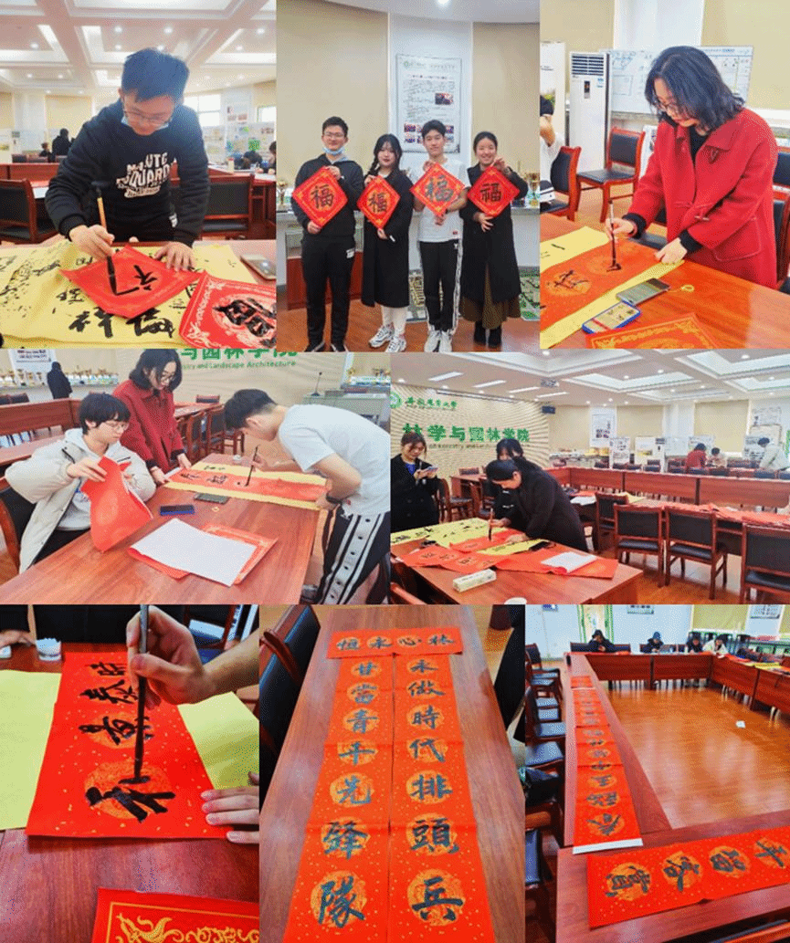 活动在《春风十里报新年》歌曲中火热进行。火红的春联纸上一个个饱满流畅的墨色毛笔字交织成吉祥美好的语句,饱含着林院学子对新年红火日子的美好祈愿。此次活动旨在使林学与园林学院思想政治教育“四小组”师生感受原创春联魅力,以点带面,展示书法艺术魅力,继承和弘扬中国优秀传统文化,增强学院文化软实力,迎接2022年的到来,展现对来年的期盼和祝福。本次活动前期由思想政治教育四小组成员积极准备创新活动形式、活动内容,活动当天成员郑骏同学现场教授大家如何写好毛笔字,全体成员共书写春联30余副、“福”字30余个并发放,其中包含传统迎新春联、含学院特色春联及成员个性化春联3大类各10余副。