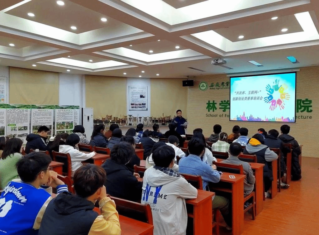 本网讯 为提高林学与园林学院同学们的创新创业能力,激发在校大学生对创新创业是兴趣,同时也为更好地参与“兴农杯、互联网+”大赛,我院于3月1日晚上7点在林学楼二楼报告厅举办“兴农杯、互联网+”创新创业类赛事培训会。学院邀请到我校创新创业学院具有丰富指导经验的张璐老师进行宣讲,本次会议由学院教学副院长张龙娃主持,项目指导老师,学院团委老师以及参赛同学参与了此次培训。