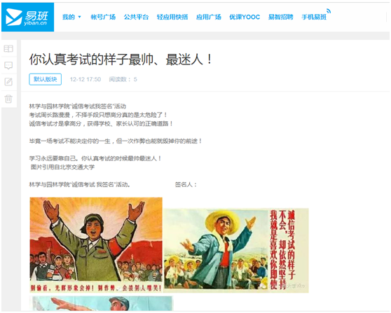 学院在易班线上平台启动“你认真考试的样子最帅、最迷人!”的诚信签名活动,组织学院学生网上签名。同时,学院也通过主题班会、向学生发放《诚信考试承诺书》等活动,开展系列考风考纪教育。