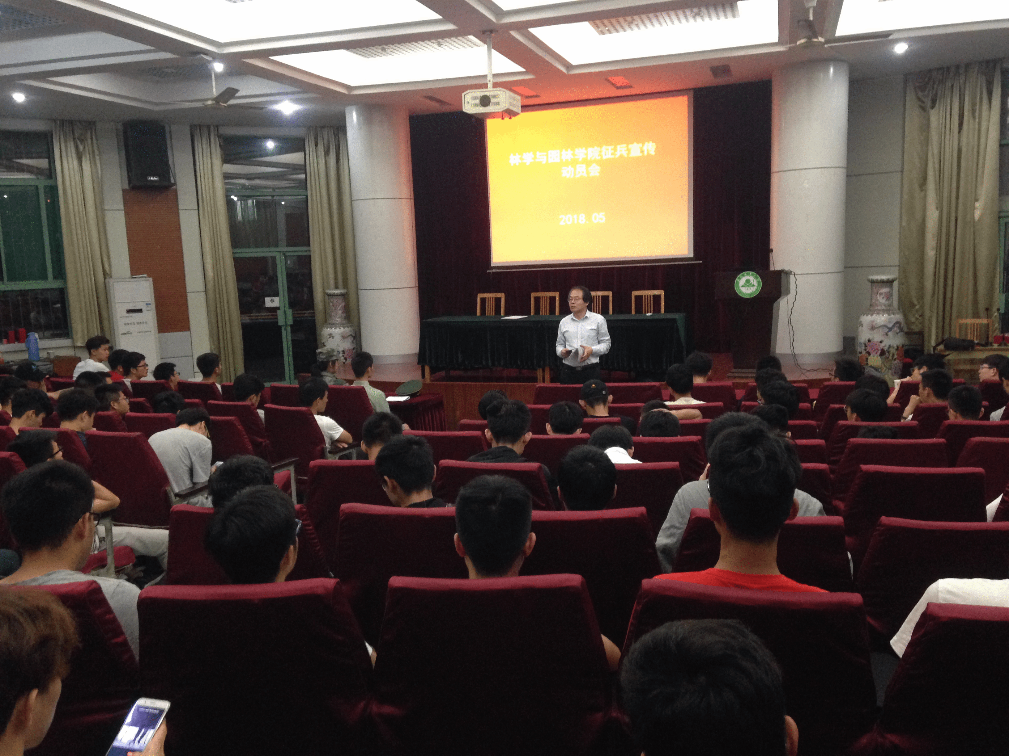本网讯:有志青年从军建功,热血男儿矢志报国。5月9日晚,林学与园林学院在林学楼报告厅举行征兵宣传动员会,学院副书记江正君参加了宣讲会,校2017年退役大学生士兵肖连晴、程盛受邀参加了宣讲。