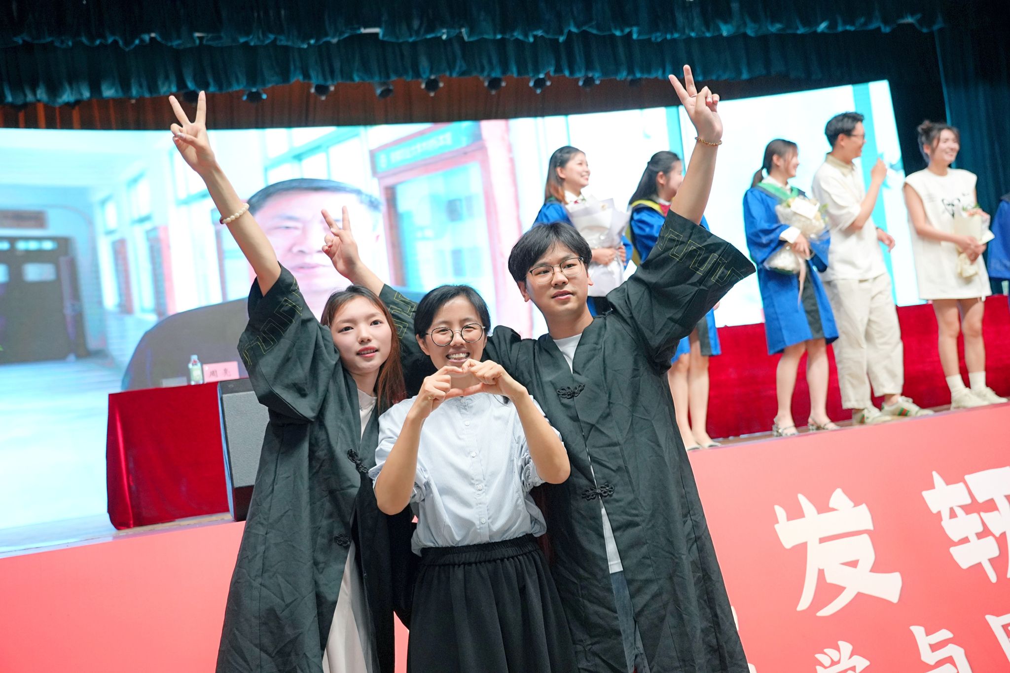 会上表彰了省级、校级品学兼优毕业生,并为全体毕业生颁发了校友卡,同学们身着学位服,依次走上主席台,接受校友卡并与主席台领导合影留念。