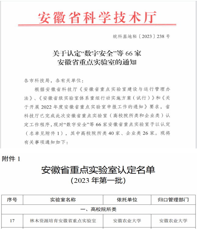 本网讯 7月20日,安徽省科学技术厅印发《关于认定“数字安全”等66家安徽省重点实验室的通知》,林学与园林学院申报的“林木资源培育安徽省重点实验”获批认定。这是我院林学学科入选安徽省高峰学科以来,在学科平台建设上取得的新突破。
