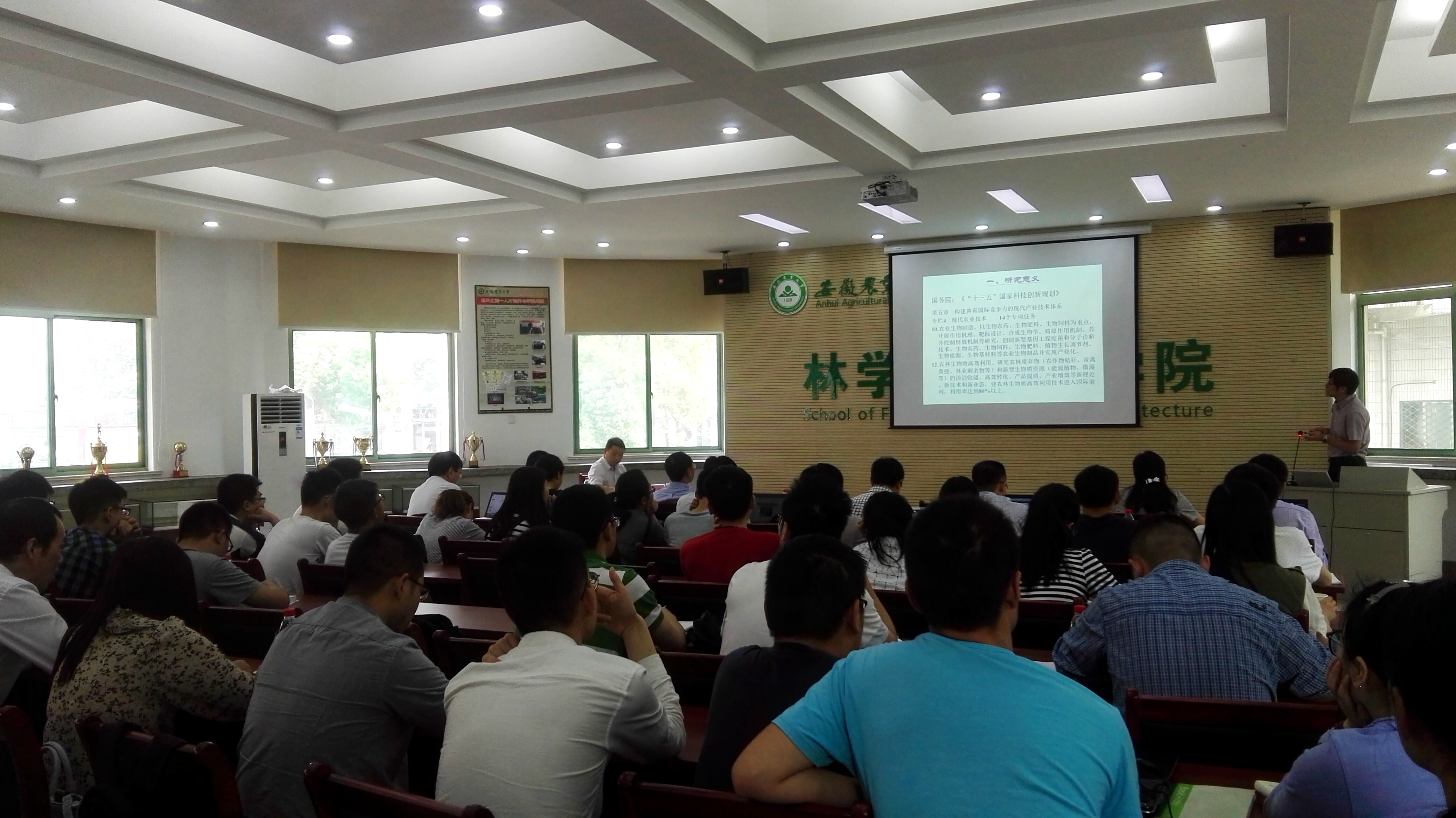 本网讯 5月24日,由中国林学会生物质材料科学分会主办,安徽农业大学木材科学与技术学科点和安徽高校科研平台“林业生物质材料”创新团队承办的“农林生物质基高分子新材料开发与应用学术研讨会”,在林学楼报告厅顺利召开。本次研讨会邀请了中国林业科学研究院副院长储富祥研究员、美国南卡罗来纳大学唐传兵教授、中国科学技术大学尤业字教授、合肥工业大学化工学院副院长丁运生教授、中国林科院林化所科技处处长刘玉鹏研究员,以及来自中国科技大学、中国林业科学研究院、东南大学、合肥工业大学、安徽大学和济南大学的20多位专家学者参会。副校长姚佐文出席会议开幕式并致辞。林学与园林学院、理学院和轻纺与艺术设计学院部分老师、研究生和本科生近100人参加了会议。会议由林学与园林学院院长刘盛全主持。