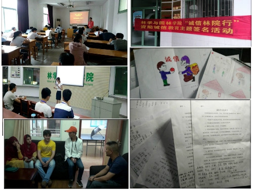 “践诚信,树林风”——诚信林风主题实践活动:诚信,不在于说,在于做。诚信林风主题实践活动,由学院牵头,带领5支诚信探索小分队深入社区、班级、寝室对现代诚信进行探索。立足校园,深入社会,诚信林风,萦绕心田。配合诚信林风主题实践活动,结束之际,举办诚信照片展,诚信林风更加沁人心脾。