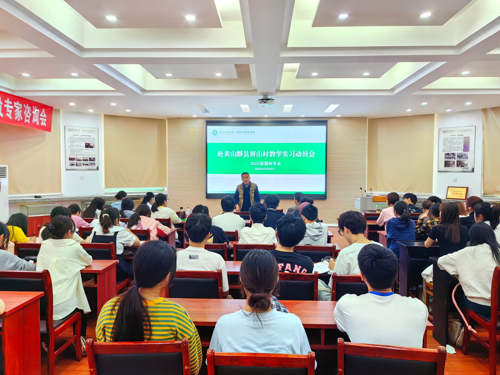 本网讯 9月26日下午两点半,林学与园林学院2022级园林专业在林学楼二楼报告厅召开赴黄山黟县屏山村教学实习动员会。院党委副书记兼22园林专业辅导员夏利明、副院长陆小彪、课程老师冯广东及2022级园林专业全体学生参加会议。