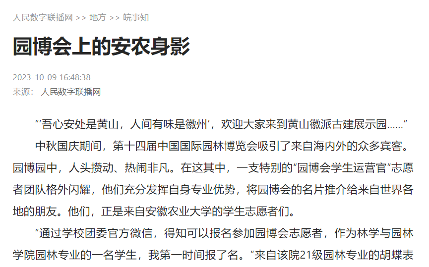 中秋国庆期间,第十四届中国国际园林博览会吸引了来自海内外的众多宾客。园博园中,人头攒动、热闹非凡。在这其中,一支特别的“园博会学生运营官”志愿者团队格外闪耀,他们充分发挥自身专业优势,将园博会的名片推介给来自世界各地的朋友。他们,正是来自安徽农业大学的学生志愿者们。
