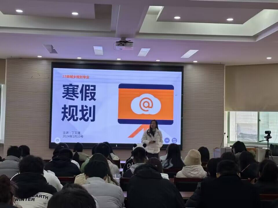本网讯 为了帮助同学更好地做好寒假规划,利用好假期充电赋能。2024年1月10日下午,2023级城乡规划专业在学院二楼报告厅召开了“畅谈寒假 展望未来”主题教育班会,班主任丁文清、辅导员王凯旋以及全体同学参加,会议由辅导员主持。