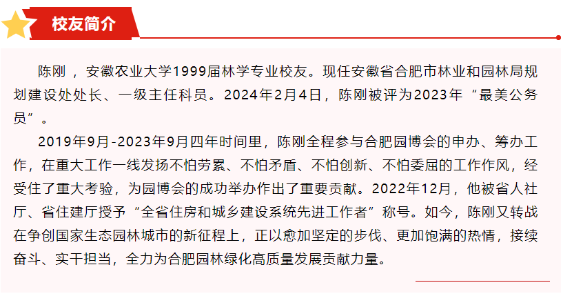 本网讯 2月4日,中组部、中宣部在北京发布2023年“最美公务员”人选,我院1999届林学专业校友陈刚光荣入选“最美公务员”,在园林规划建设岗位上,抗重担、打硬仗,敢担当、善作为,以实际行动彰显人民公仆本色。