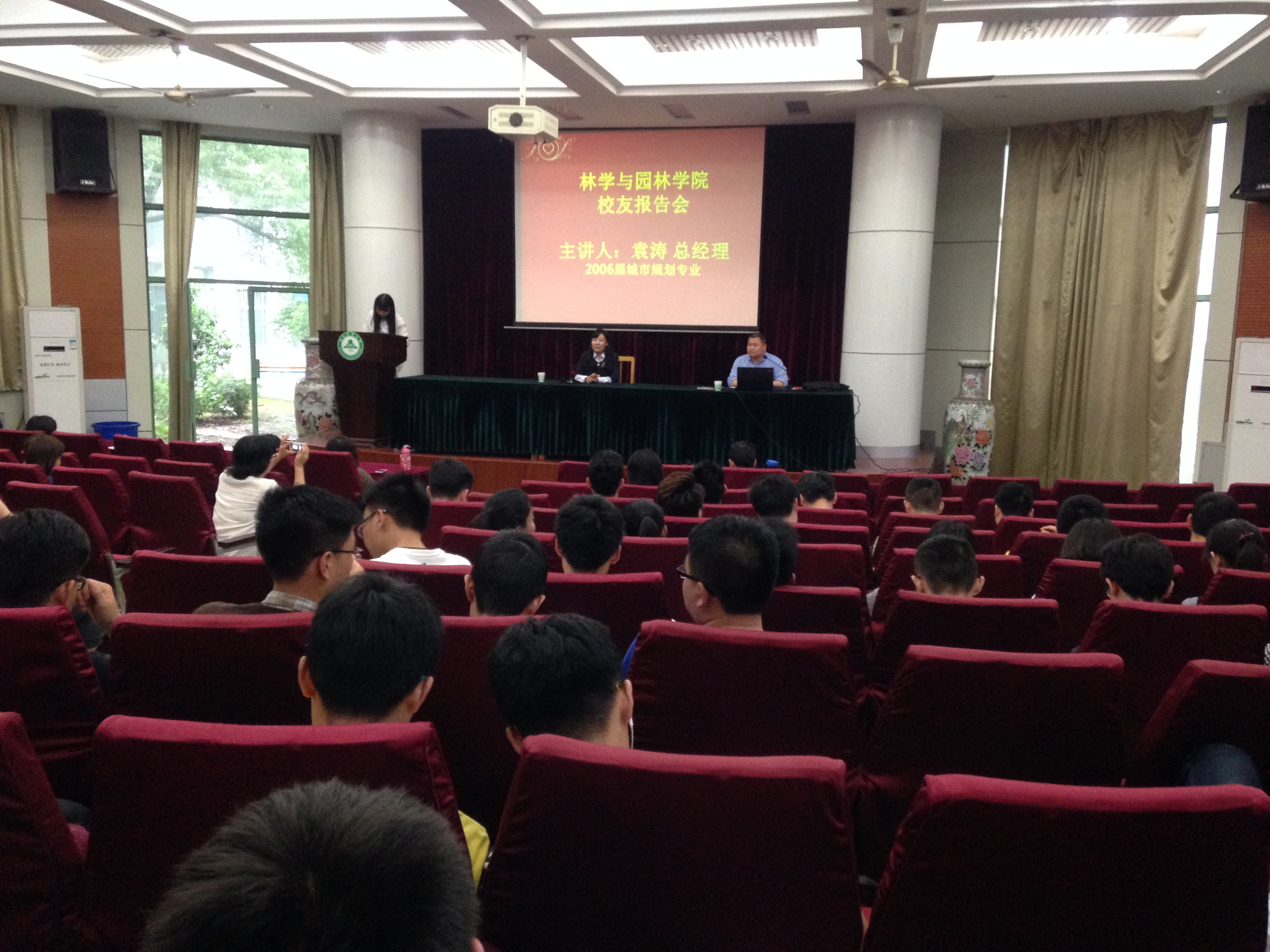 (本网讯) 6月1日下午,林学与园林学院在林学楼报告厅举行“创新创业”校友报告会。邀请学院2002级城市规划专业袁涛校友(悉创国际创始人、总经理)为同学们做“突破跨越----城市规划专业就业市场和就业创业准备”专题报告。报告会由学院党委书记唐红萍主持,城市规划系主任张云彬、副主任管欣、汪兴毅老师、刘红云老师参加了报告会。