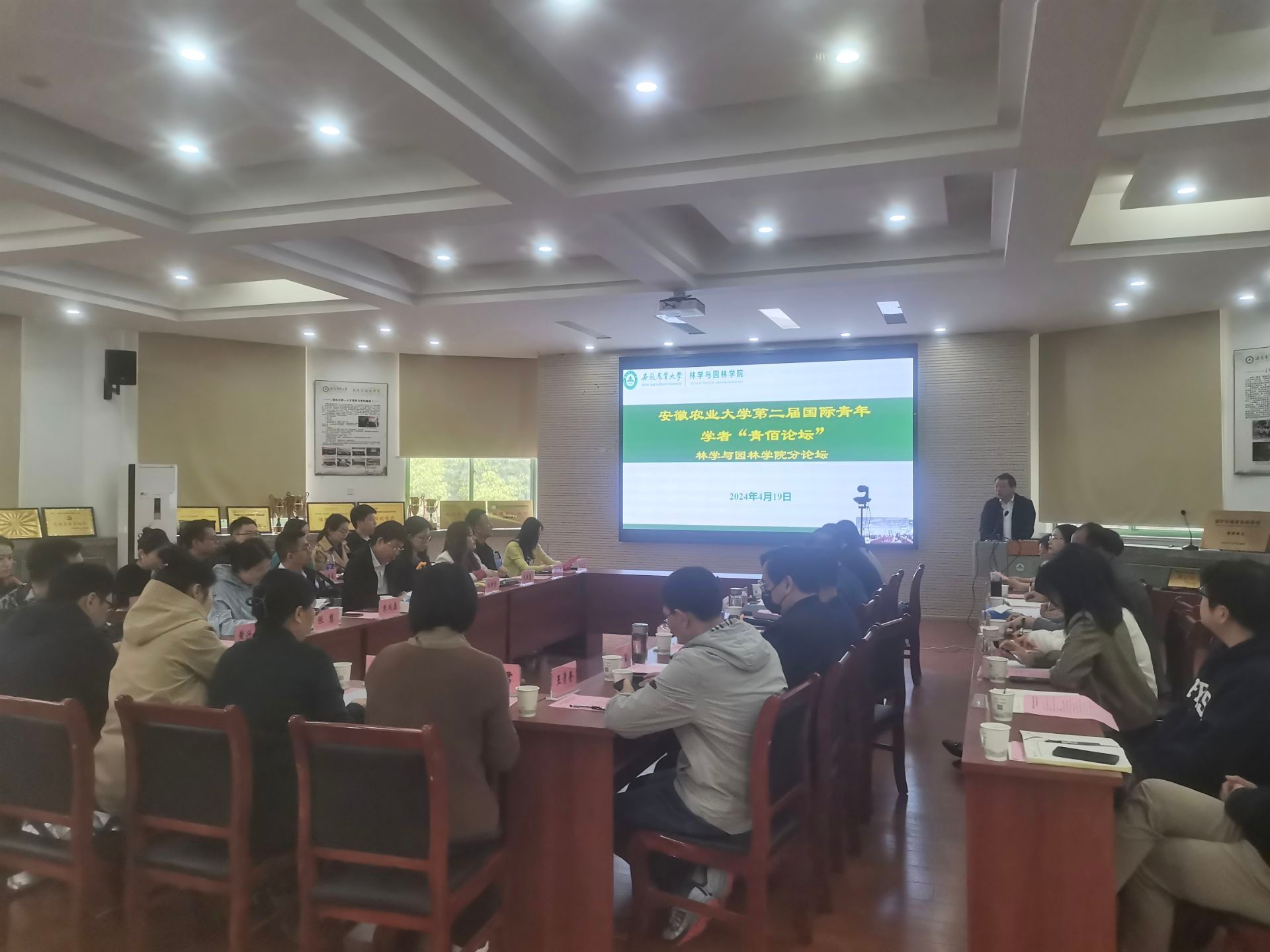 本网讯 4月19日上午,林学与园林学院在林学楼二楼报告厅线上线下同步举行校第二届国际青年学者“青佰论坛”分论坛,来自国内外各大高校、科研院所的8位专家学者、青年人才参会,学院党政领导、系部负责人及相关老师、引进人才代表参会,分论坛由学院党委书记江正君主持。