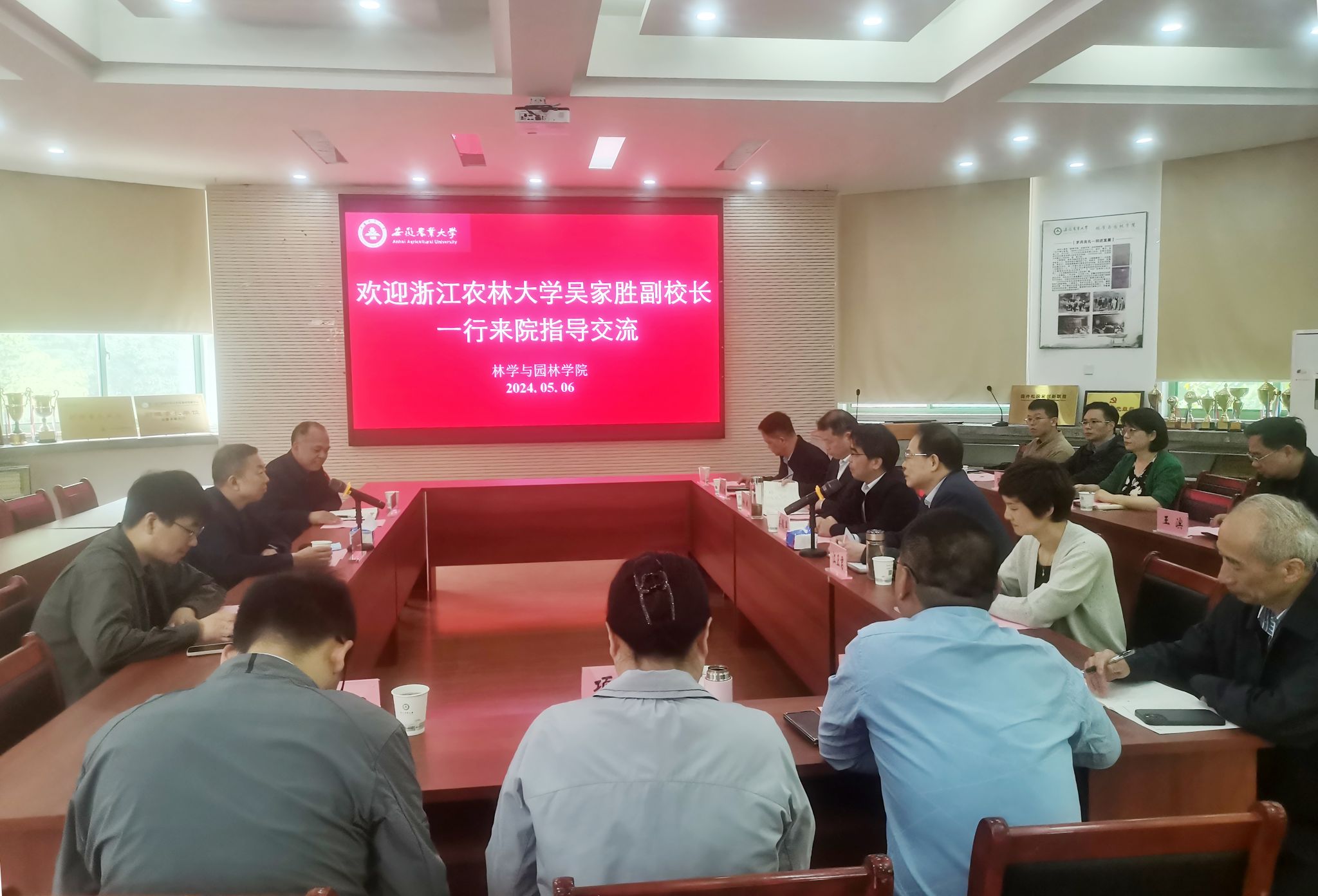 本网讯 5月6日上午,浙江农林大学副校长吴家胜一行来校,就林学学科建设发展等调研交流。校党委常委、副校长蔡德军出席会议,林学与园林学院领导班子成员、林学系负责人、相关老师参加会议。