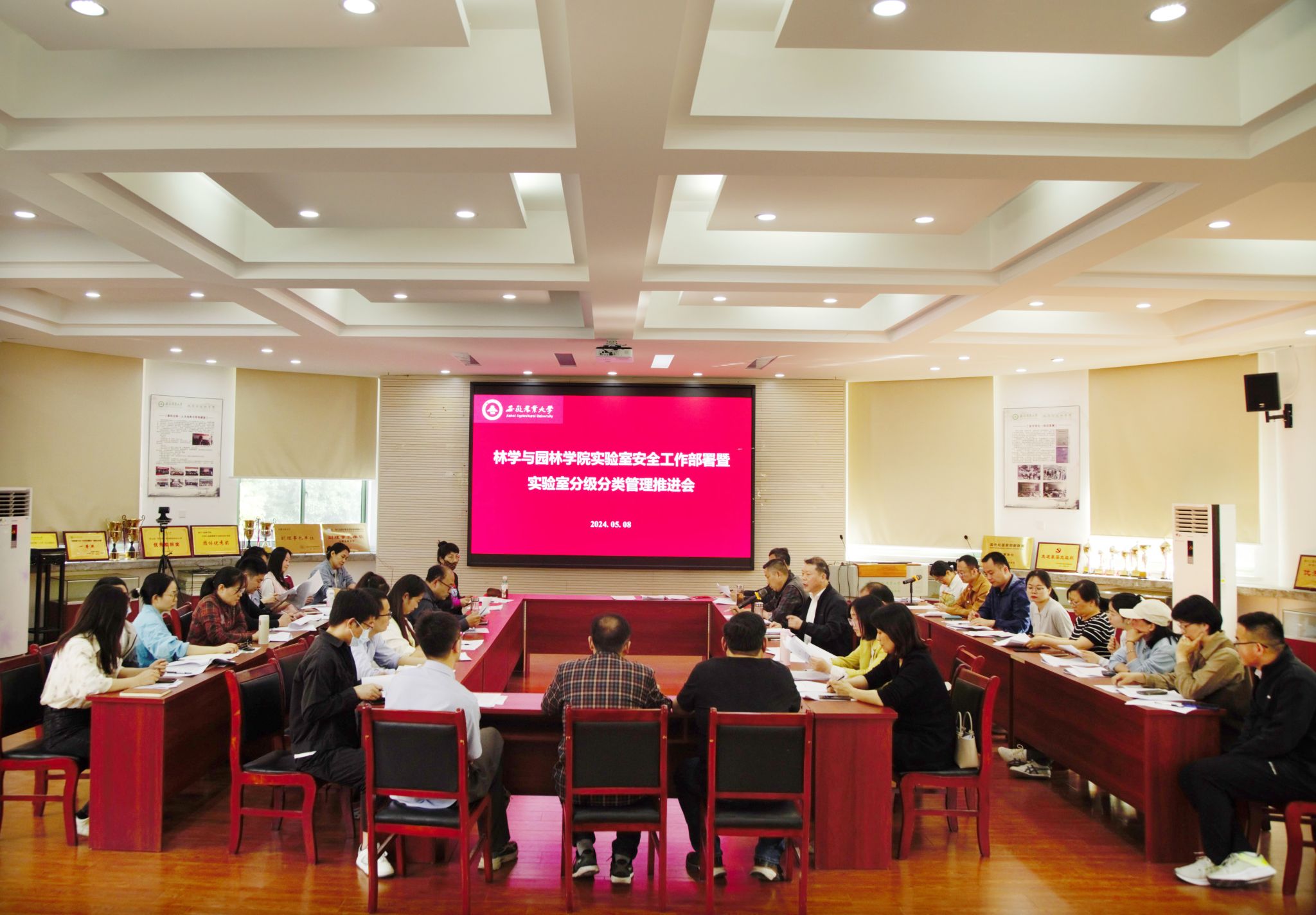 本网讯 5月8日下午,林学与园林学院在二楼报告厅召开实验室安全工作部署暨实验室分级分类管理推进会。会议由分管实验室安全工作的副院长陆小彪主持,学院领导班子成员、各系部主任、实验室安全责任人和实验中心老师参会。
