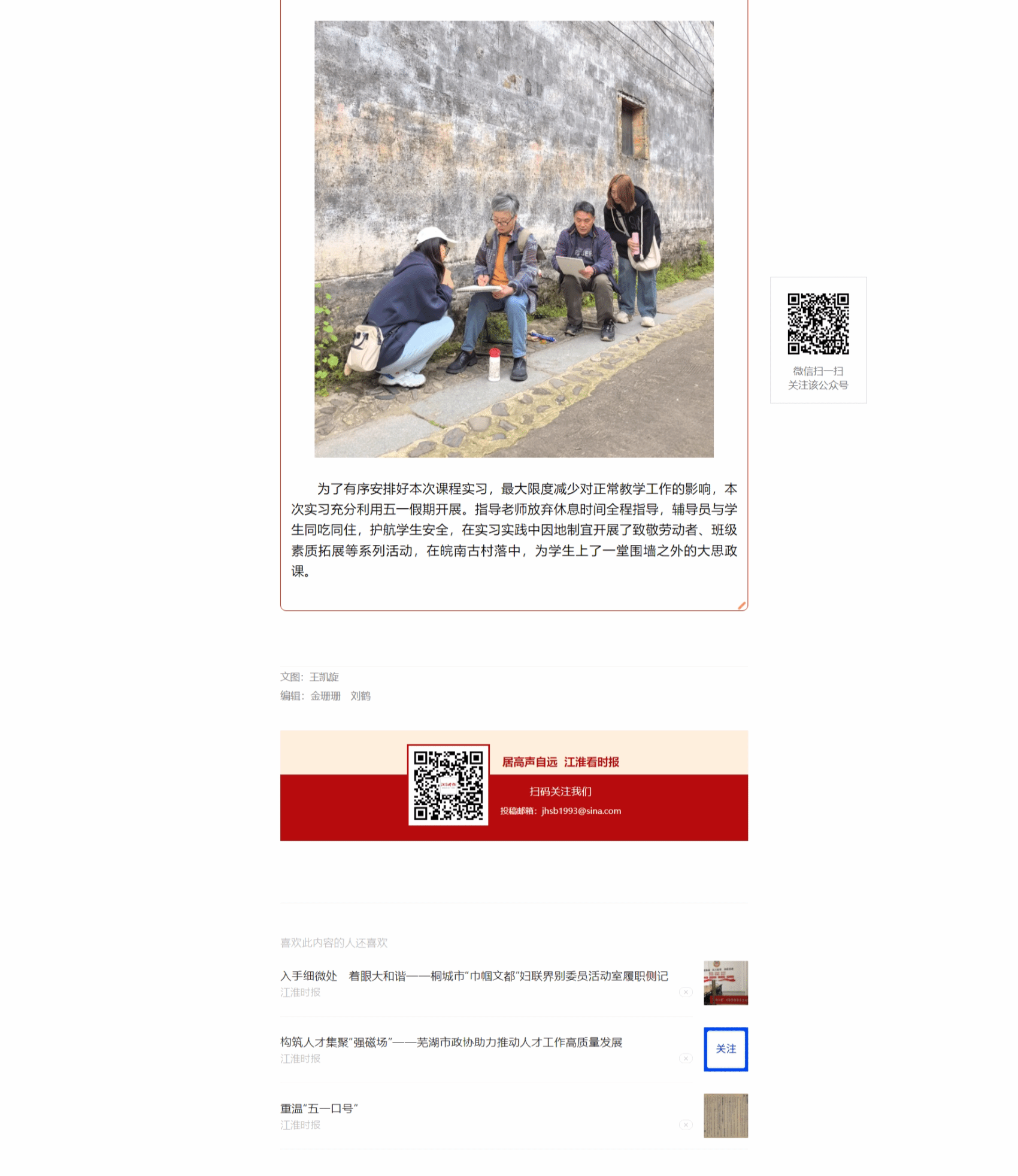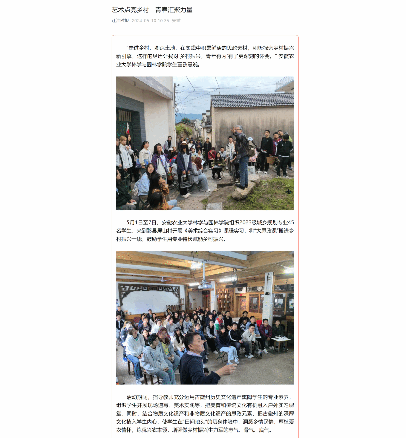 5月1日至7日,安徽农业大学林学与园林学院组织2023级城乡规划专业45名学生,来到黟县屏山村开展《美术综合实习》课程实习,将“大思政课”搬进乡村振兴一线,鼓励学生用专业特长赋能乡村振兴。近日,《江淮时报》对此进行报道。