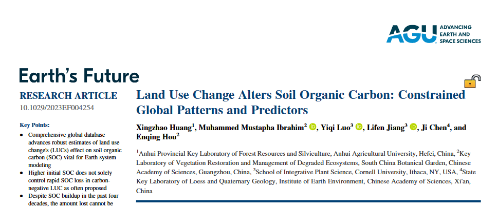 本网讯 近日,我校林学与园林学院林木资源培育安徽省重点实验室黄兴召副教授在《Earth's Future》(IF=8.2,中科院一区)发表土地利用变化对土壤有机碳影响的最新研究论文,题目为“Land Use Change Alters Soil Organic Carbon: Constrained Global Patterns and Predictors”
