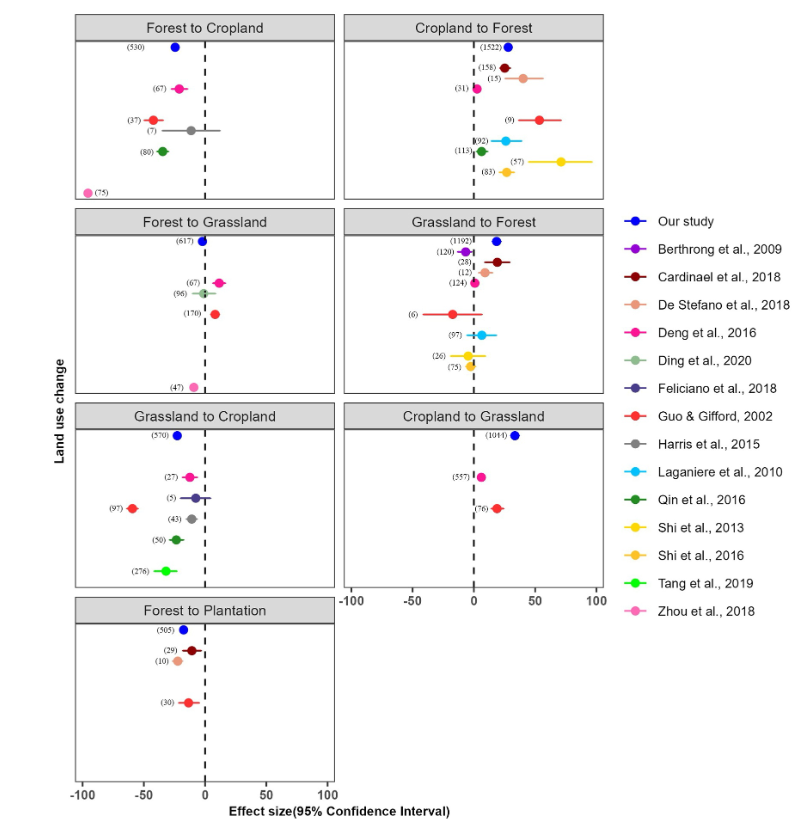 土壤是陆地生态系统最大的碳库,土壤有机碳储量(两米)是大气中碳含量的三倍。土地利用变化是仅次于化石燃料燃烧的第二大大气碳源,已成为全球环境变化的核心领域。由于观测的数量有限和地理偏差,土地利用变化对土壤有机碳的影响仍然缺乏全面的认知。我们从790篇文章中收集了84个国家7种土地利用变化类型的5980数据集,评估了森林转化农田、森林转化草地、森林转化人工林、农田转化森林、农田转化草地、草地转化农田、草地转化森林对土壤有机碳增加或者减少的绝对值和相对值,解析了气候、地形、土壤等10个变量对土壤有机碳影响的相对重要性。从1979年到2019年,退耕还林和还草仅恢复了49.5%和75.3%的土壤有机碳。我们的数据集促进了全面认识土地利用变化对土壤有机碳的影响,对开展不同土地利用变化类型有机碳变化的精准预测具有重要价值,对缓解气候变化和保障粮食安全具有重要意义。