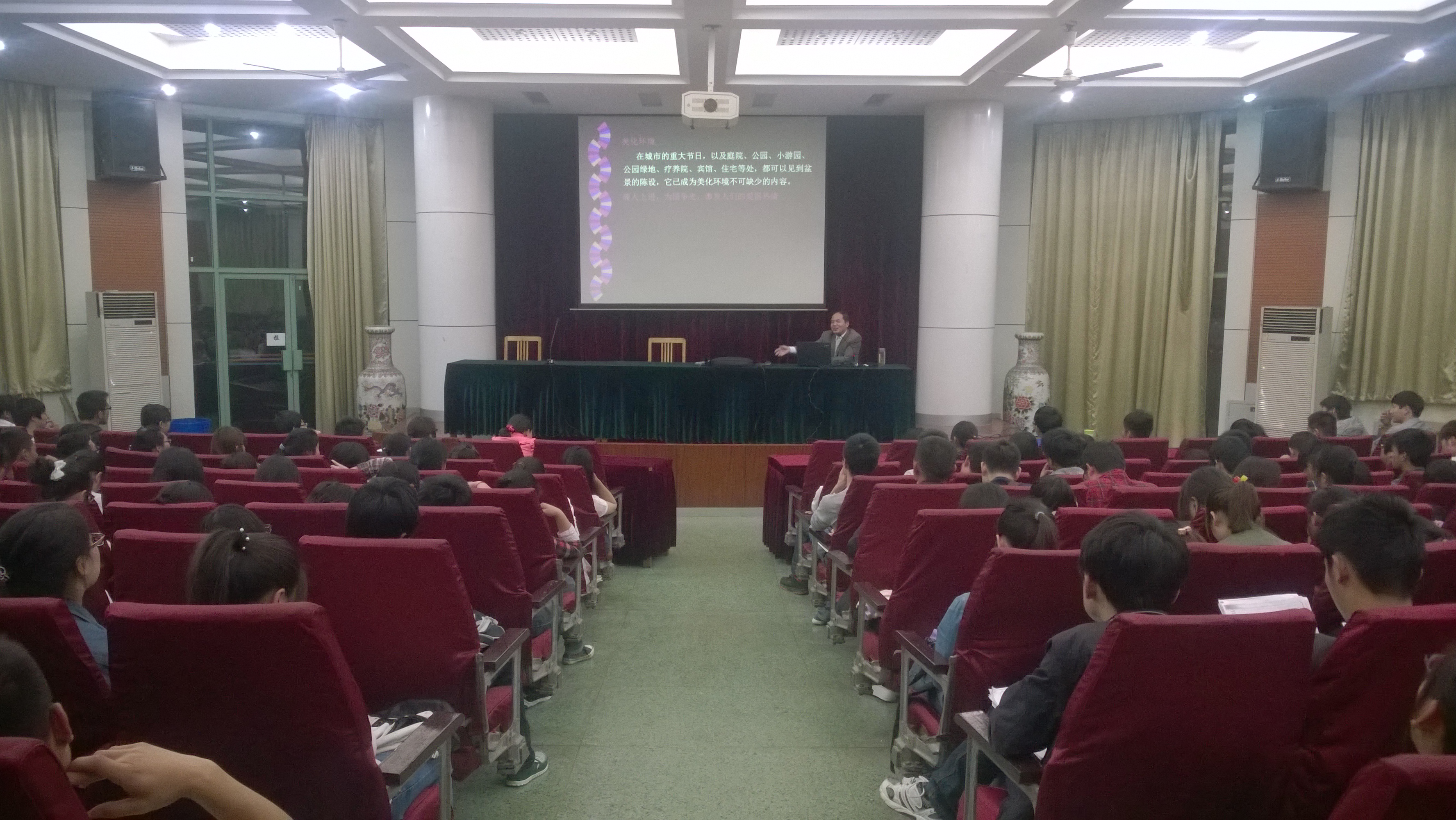 黄院长从盆景艺术的流派、盆景的组成、盆景的欣赏以及分类生动阐述了盆景艺术于现代人类生活的重要意义,强调了懂得欣赏盆景可以修身养性,提高个人的艺术修养。黄院长在讲座中不仅向同学们展现了中国盆景文化的魅力,还大方分享了自己的经验,幽默生动的语言引发同学们的阵阵掌声。本次讲座历时两个多小时,黄院长用生动的事例让同学们更加了解了盆景艺术。