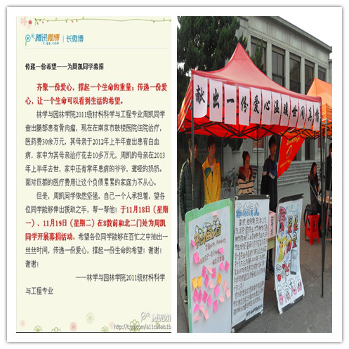 本网讯:他,是林学与园林学院11材料一名优秀的学生;他,本应该在明亮的教室中享受着学习的乐趣。可是,无情的病魔残忍地改变了他美好的生活,可恶的骨肉瘤侵害了他的身体,打乱了他原有的生活。