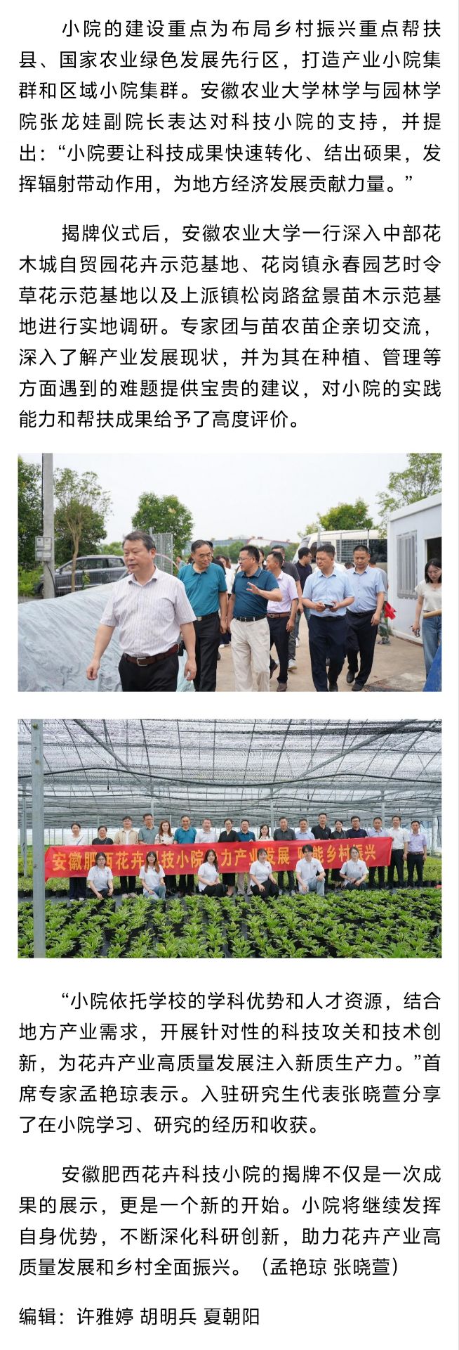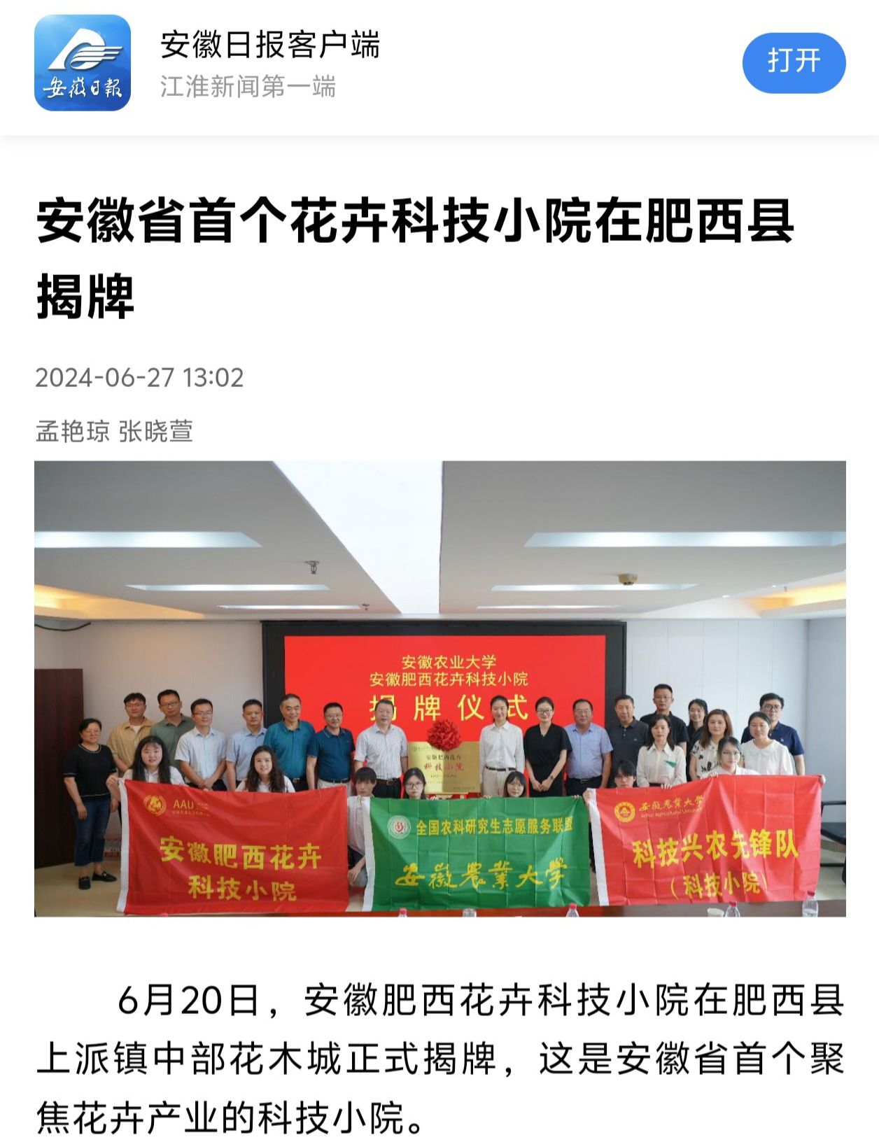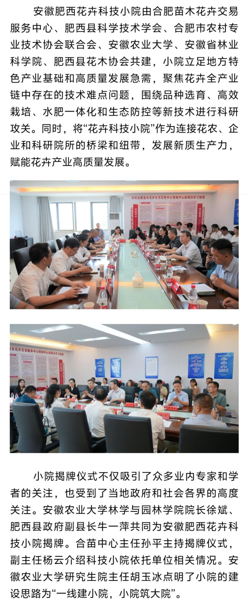 6月20日,安徽农业大学林学与园林学院院长徐斌、肥西县政府副县长牛一萍共同为安徽肥西花卉科技小院揭牌,这是安徽省首个聚焦花卉产业的科技小院。27日,《安徽日报》对此进行报道。