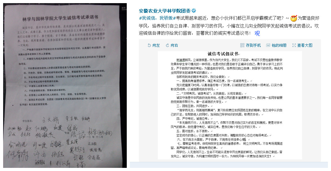 学院要求各班级利用班会等多种形式,组织学习《安徽农业大学学生手册》有关考试的相关知识,进一步明确考试纪律,杜绝可能的侥幸心理。在期末考试来临之际,李玮书记专题召开班主任会议,要求全院班主任、辅导员老师绷紧考风考纪这根弦,考纪面前一律平等,不存在人情和说情,要求老师关注本班同学动态,及时掌握信息,提前到宿舍、进考场消除可能隐患,同时做好疏导和心理辅导工作。学院也在院级考试中推行《考场记录表》,要求监考老师把考试中出现违纪但又够不上作弊的行为人都登记下来,在进行下一步的批评教育,堵死可能的漏洞。