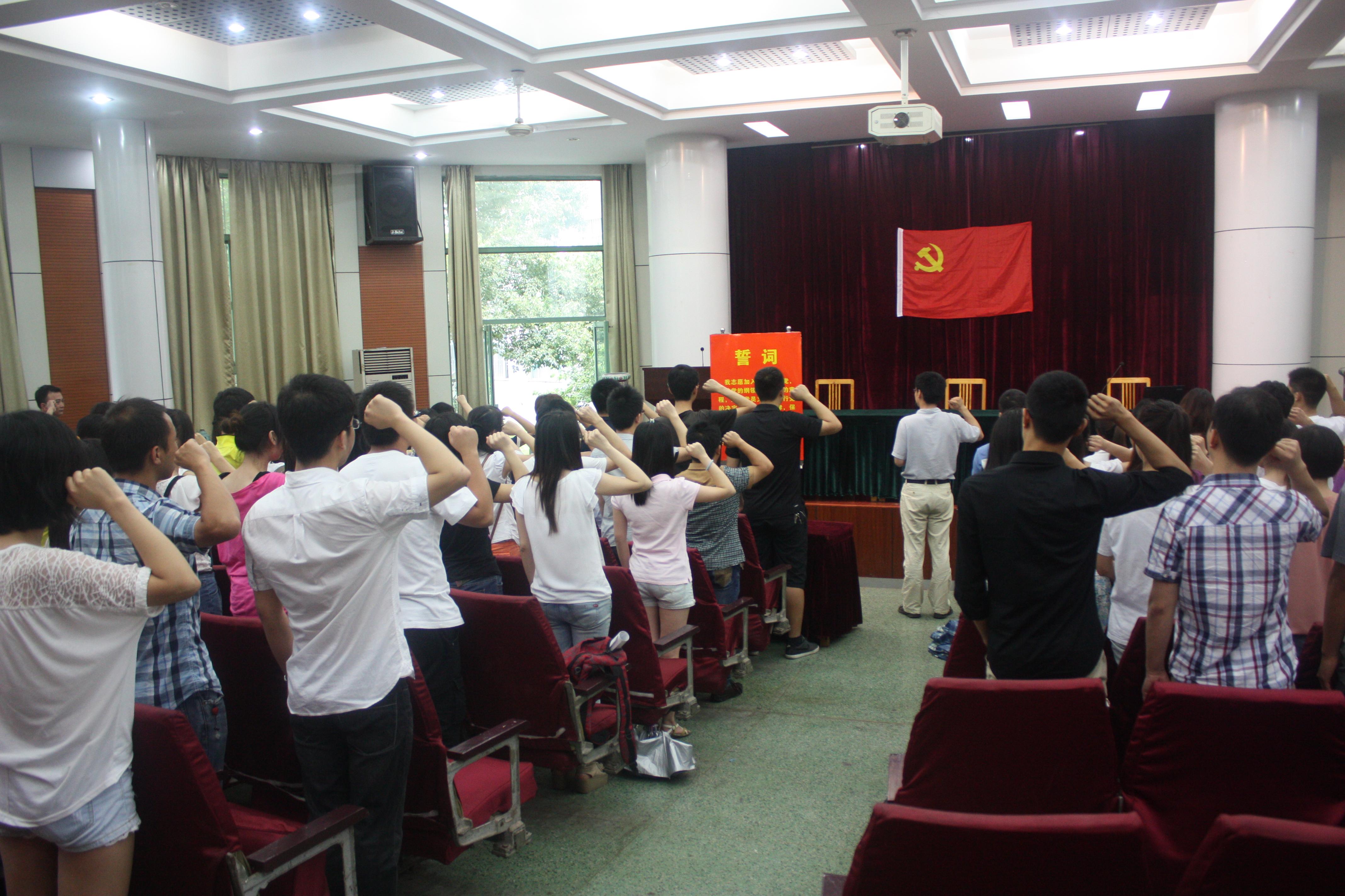 伴随着雄壮的《国际歌》,大会拉开了序幕。在神圣的党旗面前,本期发展的29名预备党员在党委副书记李玮的带领下举行入党宣誓,同时全体党员重温入党誓词。宣誓完毕后每个党员在党旗下报下自己的姓名。