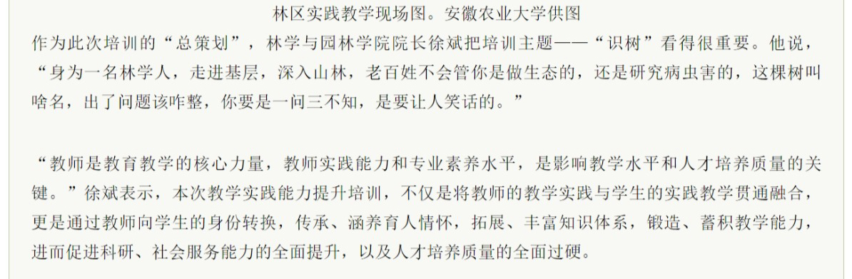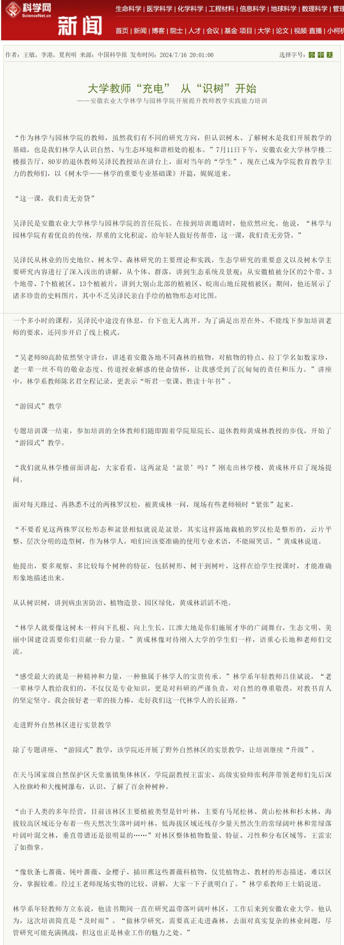 7月11-14日,林学与园林学院启动教师教学实践能力提升计划,特邀学院首任院长、退休教授吴泽民,学院原院长、退休教师黄成林教授等名师大家,为林学系全体教师及部分相关专业教师开展专题培训、校内实践训练,同时深入天堂寨自然保护区,进行野外实景教学,进一步夯实教师专业水平,提升教育教学质量,并通过教师专业知识、教学能力的全面提升,促进人才培养质量的全面过硬。7月16日,《科学网》对我院此项工作进行了专题报道。