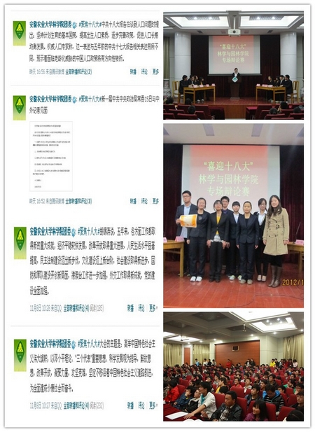 学院的微博建设不断完善,林学与园林学院团委官方微博作为林院小记者,在十八大召开前期和开会期间特开辟“聚焦十八大”专题,跟踪报道十八大实时动态和最新理论发布,并每天更新一条十七大至十八大期间的国家大事和思想进步,同时发起同学进行讨论,让更多的同学了解十八大,学习党的十八大精神。