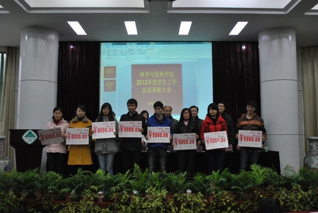 会议在国歌声中拉开帷幕。学院对2012年在日常教育与管理,各级各类竞赛和团学活动中涌现出来“我为林院增光彩”的先进集体和个人进行了表彰,分为”学院特别贡献奖”、“校级先进个人及先进集体”、“院级先进个人及先进集体”、“专业技能(省级)竞赛获奖”四大板块,颁发获奖证书。两位获奖同学代表也做了发言。