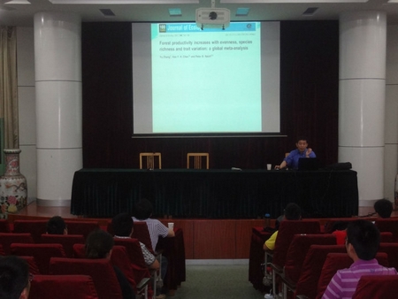 报告会上,陈汉教授介绍了自己在森林生态学研究的多个领域的研究进展,阐述了森林生物多样性、生态功能、生态恢复、气候与森林固碳关系等研究领域的部分成果。同学们认真倾听了陈汉教授的报告,并在报告结束后进行了与陈教授的“面对面”互动,同学们纷纷就自己感兴趣的话题进行提问,陈汉教授对同学们提出的二十余个问题分别做了非常耐心地回答。整场报告会气氛热情洋溢,最终在同学们热烈的掌声中落下帷幕。