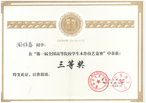 本网讯:9月1日,全国首届高等院校学生木作技艺竞赛在浙江农林大学拉开帷幕。来自全国数十家高校的涉木专业在校学生,在浙江农林大学通过现场手工打造家具等形式,比赛木工制作技能、展示设计及动手能力。比赛由国际木文化学会(IWCS)发起,并联合中国浙江农林大学支持举办,分本科和高职两组,分别设一等奖一名,二等奖一名,三等奖两名,优秀奖若干。林学与园林学院选派了2009级木材科学与工程专业周维昌同学参加了此次比赛,喜获本科组三等奖。
