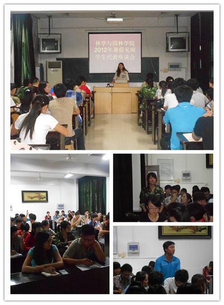 本网讯 9月14日中午,林学与园林学院在林学楼106教室召开2012年暑期见闻座谈会暨“双百”工作推进会,全院各班班长、团支书,院学生会干部代表、部分老生和新生代表参加了会议,会议由团委老师主持。
