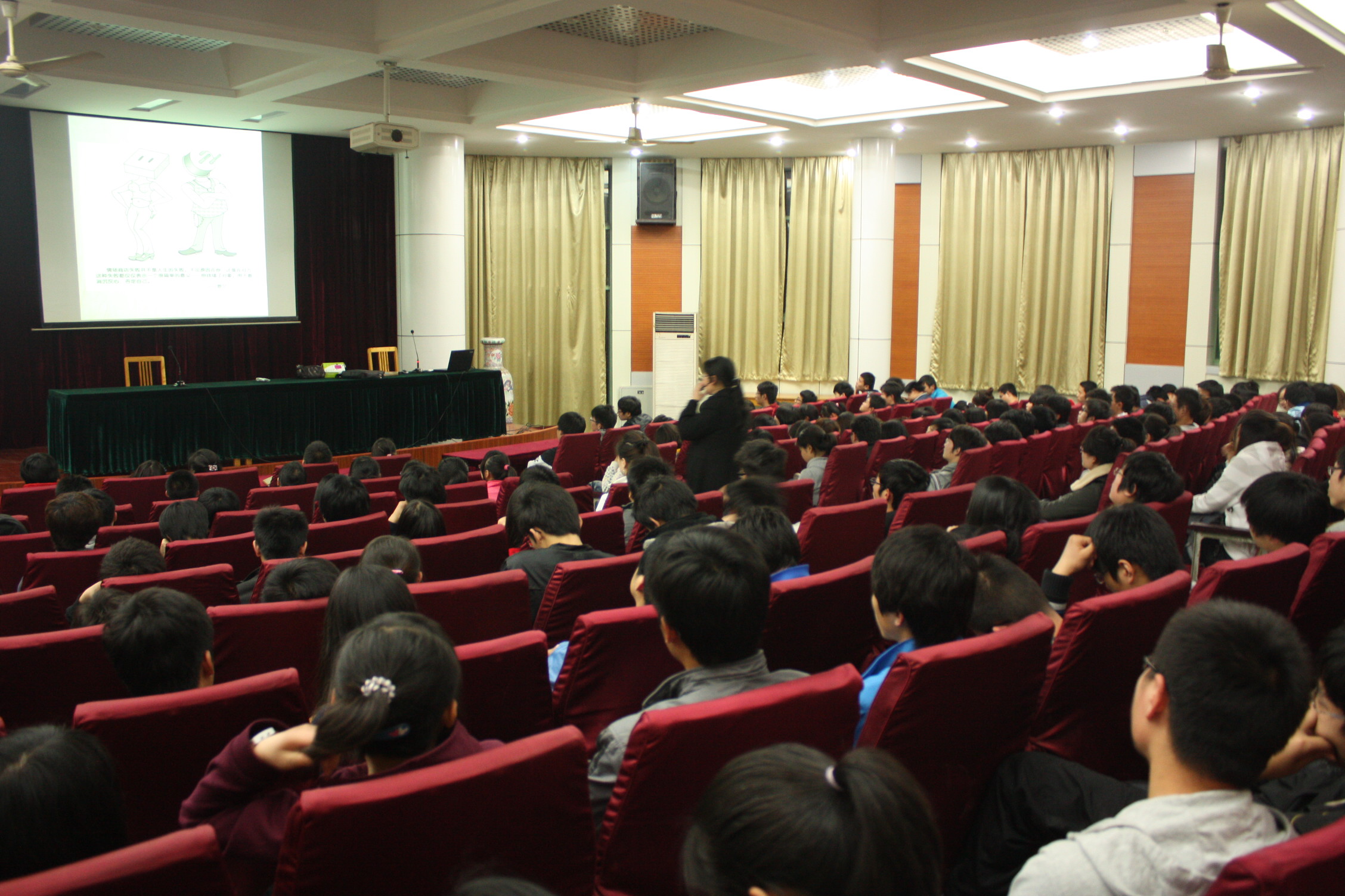 本网讯 3月26日晚,林学与园林学院在林学楼报告厅举办了心理健康辅导讲座,主讲人园艺学院党委副书记葛红带领着大家一起探讨 “面对爱,感受爱,学习爱-大学生爱情观”。 讲座由团委老师主持。各班级心理委员、部分国助生代表和一些有兴趣的同学,共约300人参加了辅导,一些同学站着听完了报告。