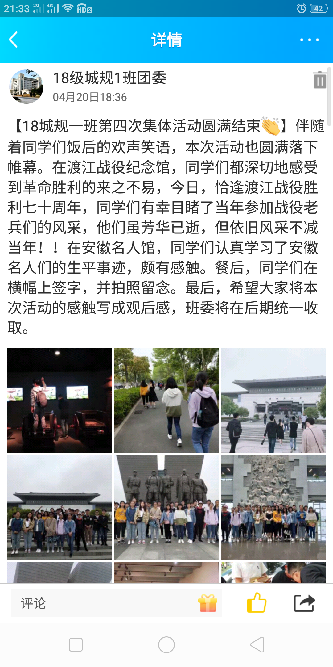 18城规、18木材等专业的同学们集体参观了安徽名人馆、安徽省博物馆、渡江战役纪念馆等地点。同学们通过实地学习了解历史,缅怀五四先驱崇高的爱国情怀和革命精神.