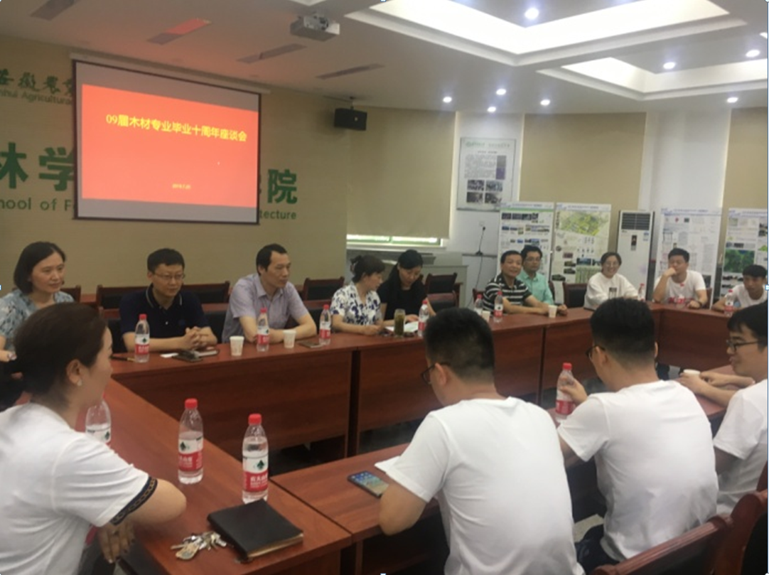 2019年暑期,炎炎夏日,林学与园林学院迎来了2009届木材科学与工程专业校友毕业十周年返校聚会,并在学院二楼报告厅举办了座谈会。林学与园林学院党委书记唐红萍及各位学科老师代表受邀参加,并代表学院向校友们表示热烈欢迎。唐红萍介绍了近10年来学校和学院的发展状况、取得的成绩,表示学校学院一如既往地关注校友发展,对各位校友取得的成绩表示祝贺。也希望各位校友关注母校,心系母校,把母校作为最坚强的后盾,努力拼搏取得更优异的成绩。最后希望各位校友常回家看看。校友们借助这个难得的机会共叙师生情、同窗谊,共同祝福并感恩母校。