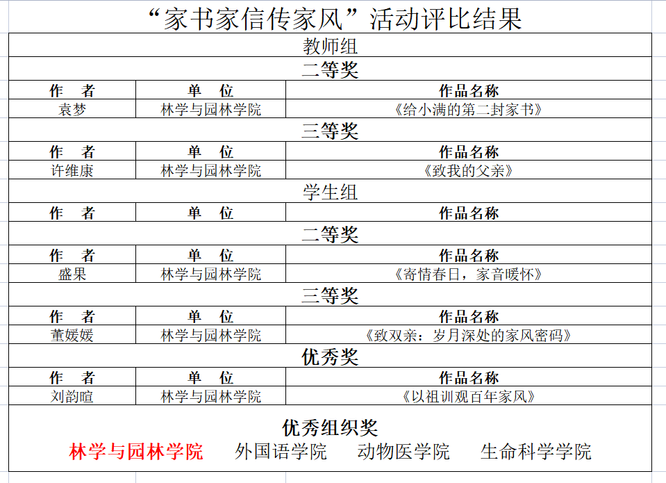 一直以来,林学与园林学院不仅注重专业知识的传授,更重视学生与教师的文化素养培育和精神文明建设。此次在“家风家信传家风”活动中的优异表现,是学院在文化育人方面的又一硕果。学院将继续秉持这一理念,积极组织师生参与更多文化活动,传承优秀传统文化,弘扬良好家风,为培养德才兼备的高素质人才持续发力。(图文/吴倩云 编辑/胡先业 初审/陈枫 终审/江正君)