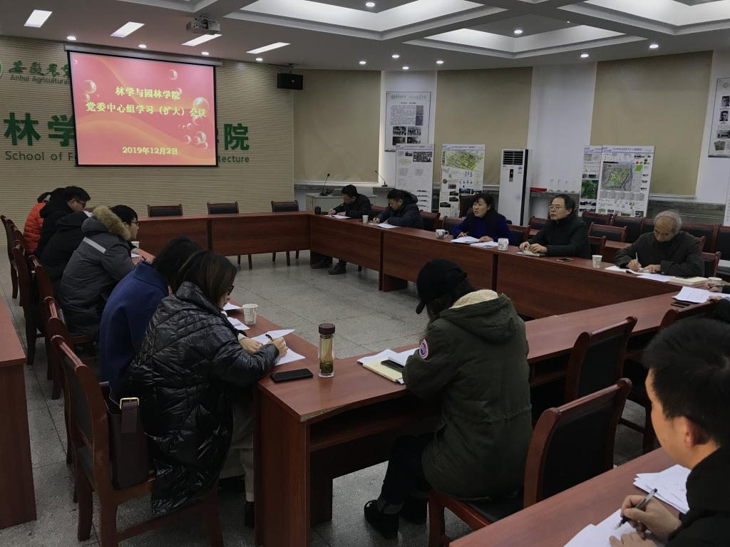 本网讯 12月2日上午,林学与园林学院党委中心组(扩大)学习会议在林学楼二楼报告厅召开。学院党委委员、处级领导干部、党支部书记参加会议。会议集中学习了党的十九届四中全会精神、习近平关于“三农”工作论述等内容,由院党委书记唐红萍主持。