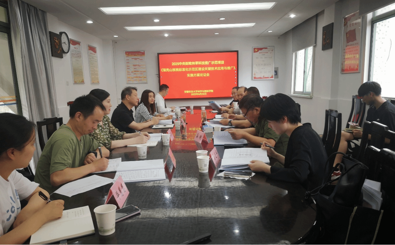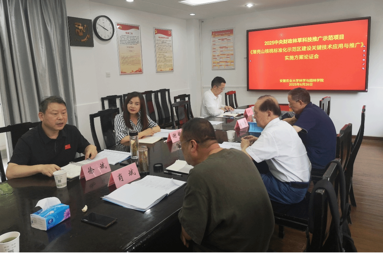 本网讯 6月26日下午,2025年中央财政林草科技推广示范项目《薄壳山核桃标准化关键技术应用与推广》实施方案专家论证会(以下简称“实施方案论证会”)在合肥召开。会议由林学与园林学院牵头,安徽佳烨农业有限公司承担具体实施任务。安徽省林业科技推广总站、安徽省木本油料协会、安徽省林科院等单位专家,以及项目实施单位和承担单位相关人员参加会议。会议由安徽省林业科技推广总站肖斌教授级高级工程师主持。