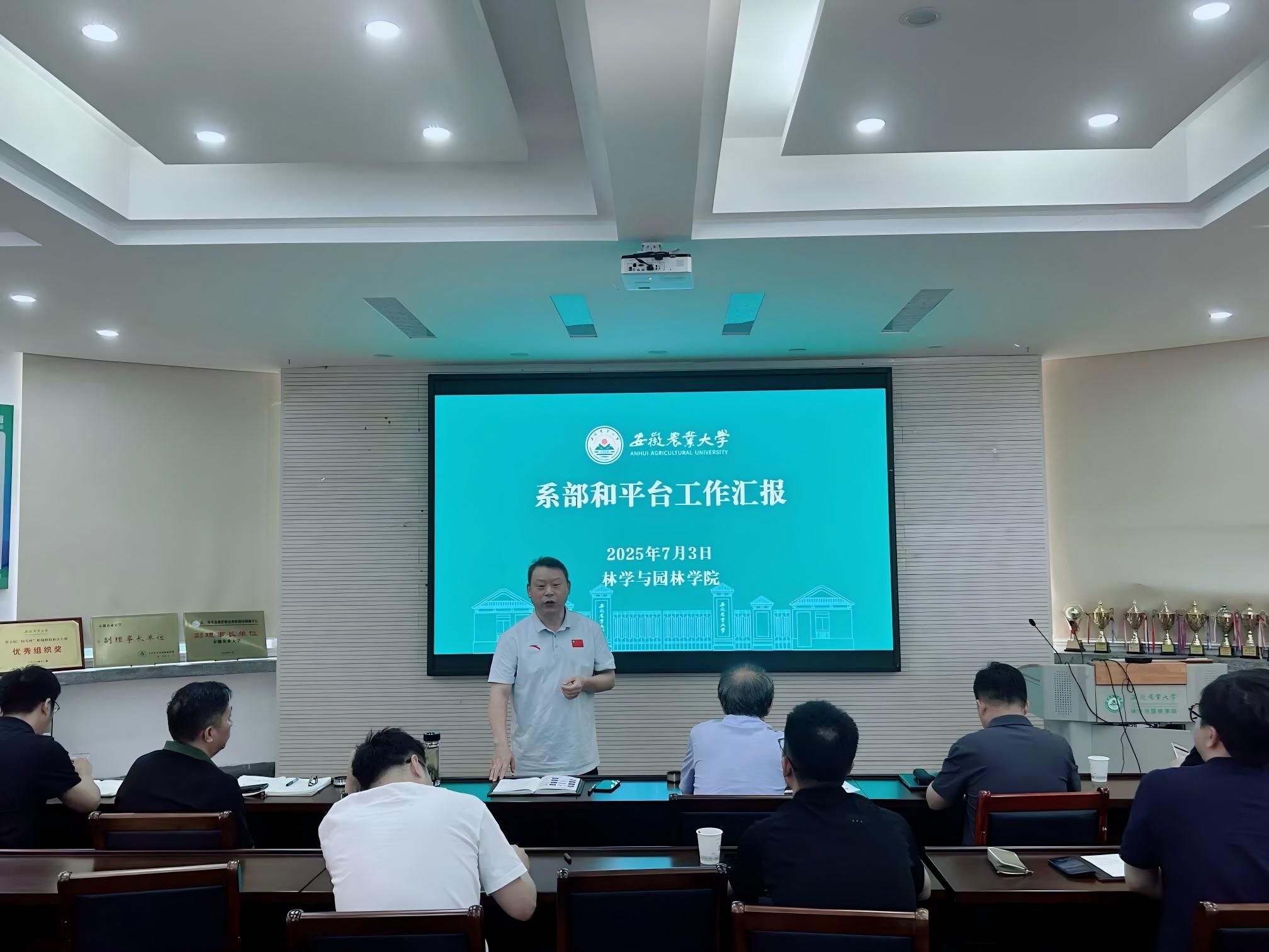 本网讯 7月3日下午,林学与园林学院在林学楼二楼报告厅召开2025年度年中工作总结暨重点工作推进部署会,全面总结上半年各项工作进展及成效,部署下半年重点任务。学院领导班子成员、系部主任、平台负责人参会,会议由学院党委副书记、院长徐斌主持。