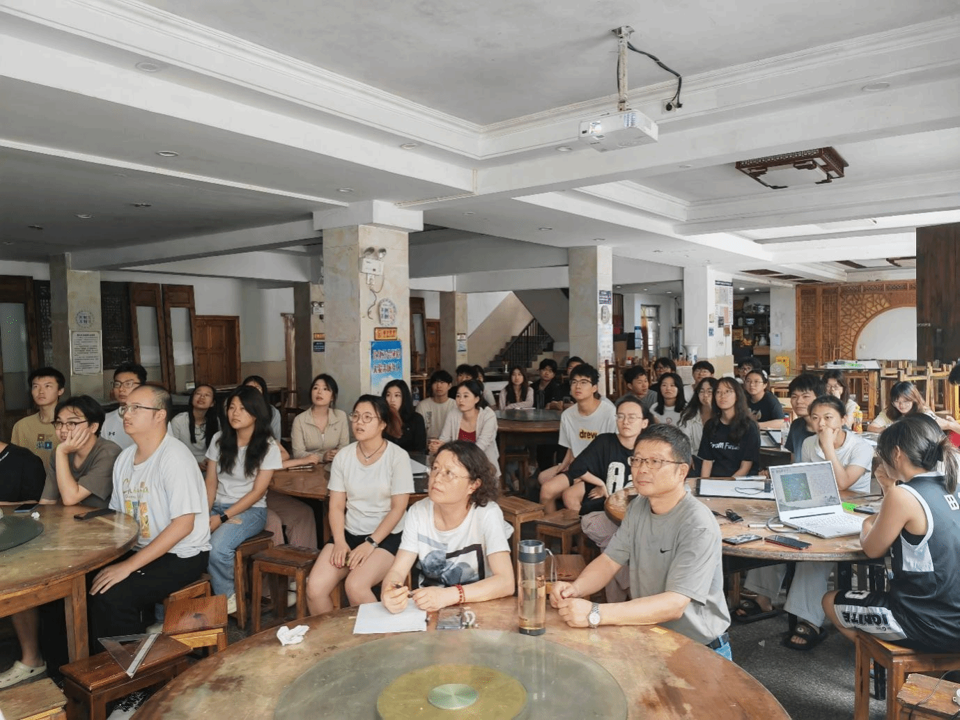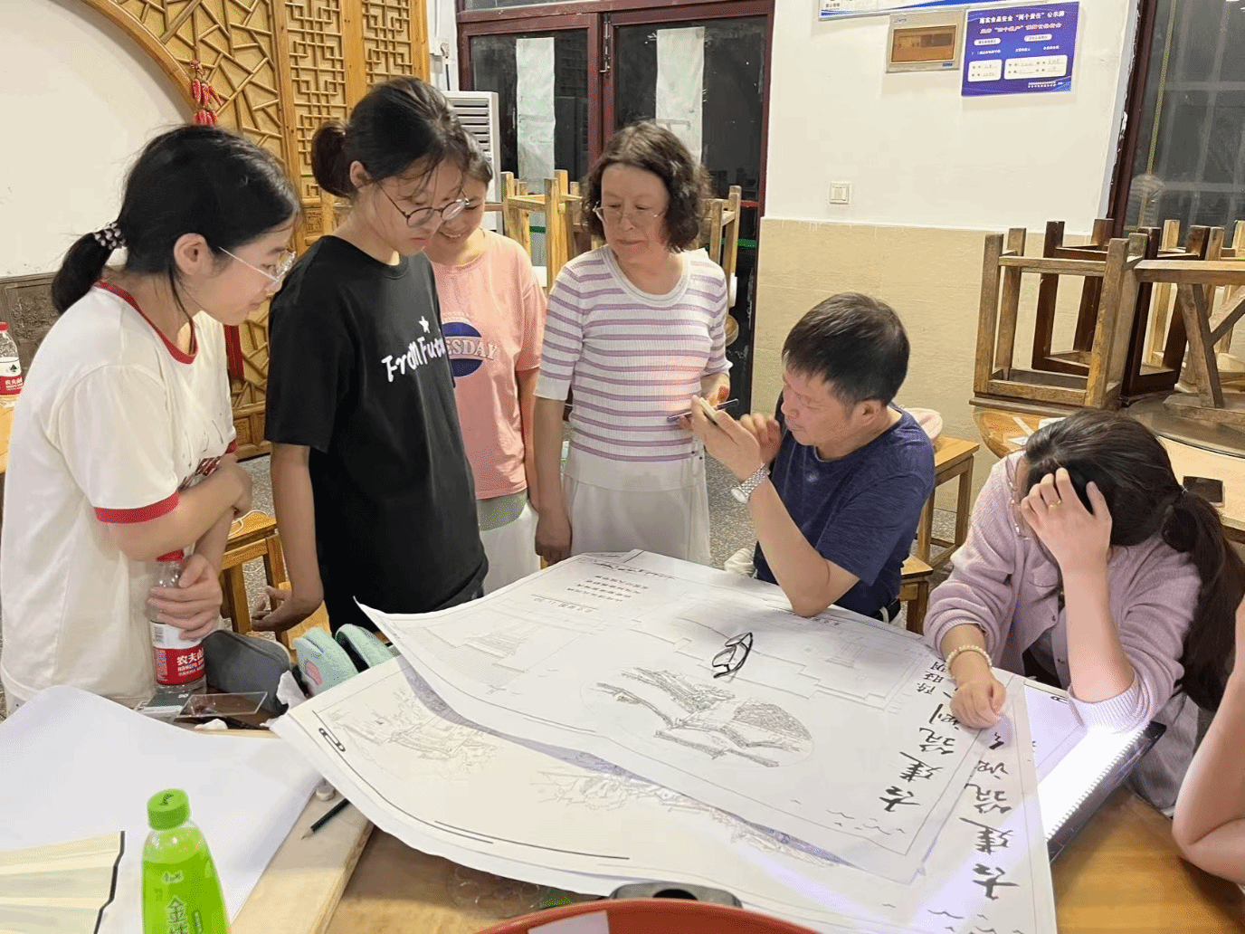 实习期间,师生团队综合运用测距仪等现代测绘技术,结合手工丈量与传统绘图,对古宅的平面布局、立面形制、结构体系、装饰艺术进行多维度记录。师生每日召开总结会,将当天采集的数据导入CAD进行空间分析并对各组草图进行纠正。经过8天高强度作业,实习团队圆满完成既定任务:绘制完成 6 栋古宅的全套测绘图纸(含平面图、立面图、剖面图、大样图等)。